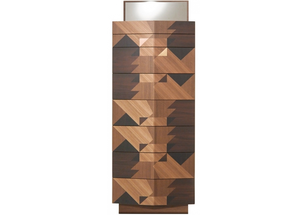 Narrow and elongated, Maggio desifned by Alessandro Mendini for Porro is an amusing chest of drawers crowned with a mirror with a diamond-shaped section, 2 pullout trays and 6 large drawers. It is created with an inlaid design on the front, achieved by combining three different types of wood – elm, oak and acacia – according to abstract geometric compositions.