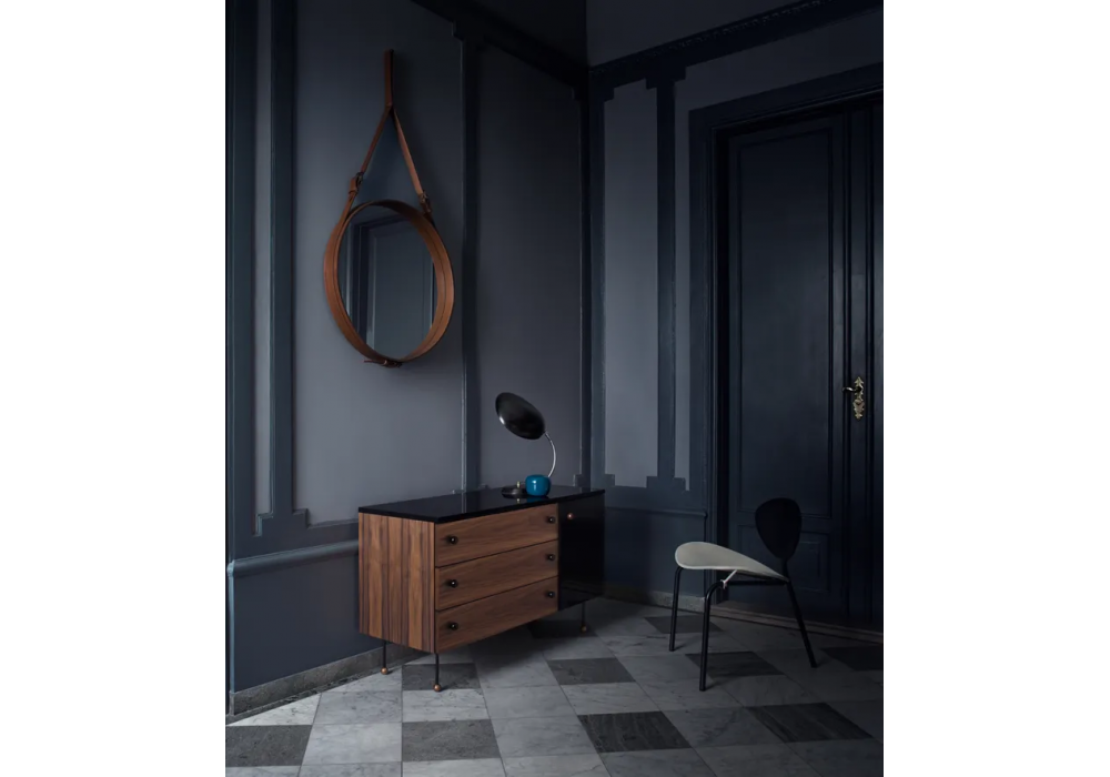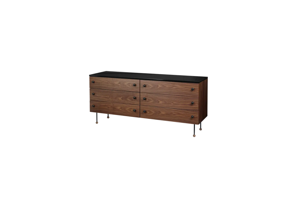 62 Dresser, von Greta M. Grossman für Gubi entworfen, ist eine Kommode aus amerikanischem Walnussfurnier, kombiniert mit einer Tischplatte aus hochglänzendem schwarzem Laminat. Die Beine sind aus pulverbeschichtetem Stahl. Verfügbar in drei Modellen.