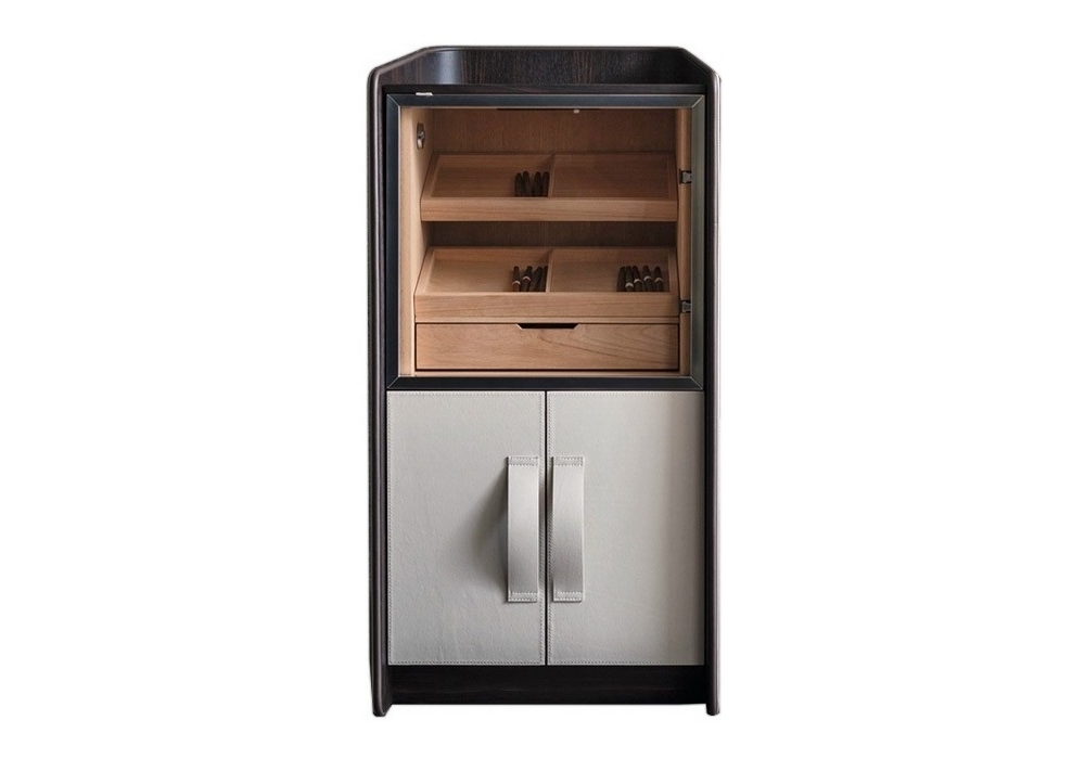 Gentleman von Carlo Colombo für Flou entworfen, ist ein Zigarrenschrank mit Struktur aus gebogenem Pappelsperrholz, außen mit Leder bezogen, innen mit mattem Ebenholz 089. Umfangskordel aus Leder. Top in: Ebenholz matt 089 oder Marmor. Fronten und Griffe in Leder. Oberes Zigarrenfach mit spanischem Zedernholz bedeckt, Zigarrenschalen und Luftbefeuchterschublade aus massivem spanischem Zedernholz, ausgestattet mit Hygrometer zur internen Feuchtigkeitskontrolle. Interner Batteriescheinwerfer. Schließtür mit matt brüniertem Rahmen und bronzefarbenem Hartglas. Unteres Fach mit lederbezogenen Türen und Griffen, Innenausstattung in Ebony matt 089 mit Batteriescheinwerfer.