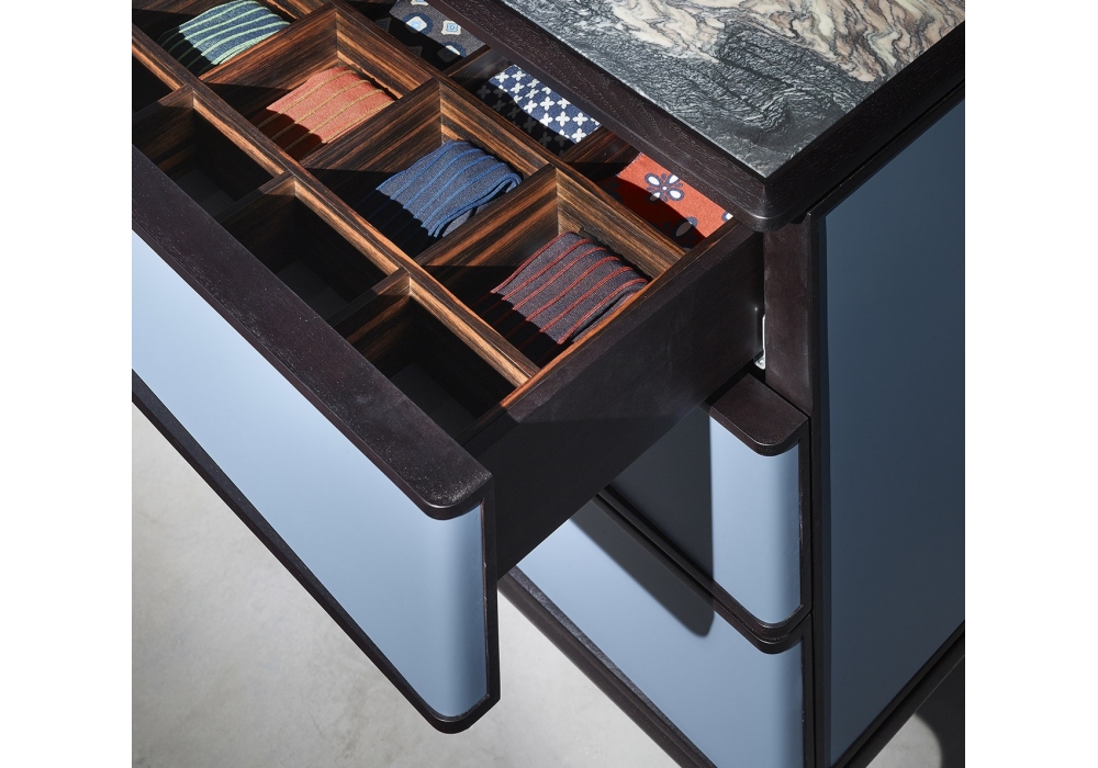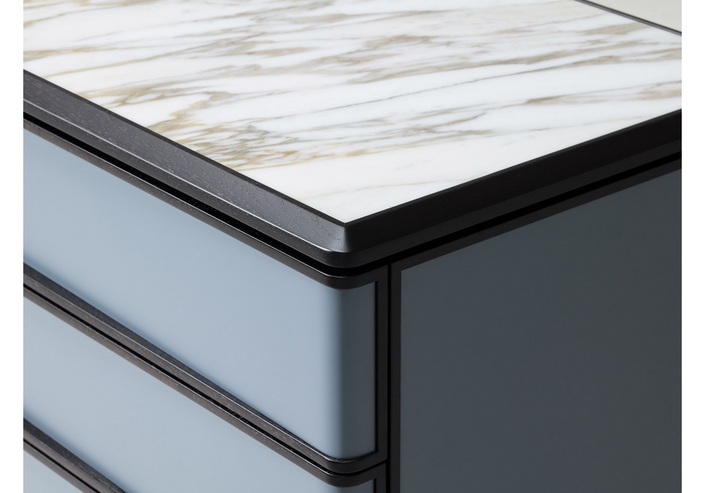 Oblique von DRAW für Ceccotti Collezioni entworfen, ist eine Kommode mit Struktur und Boden aus massivem amerikanischem Nussbaum. Türen, Seitenwände und Schubladenfronten aus Rosenholz, Ebenholz, Leder oder matt lackiert. Platte aus Nussbaum, Marmor oder lackiertes Glas. *Angabe des RAL-Farbcodes für Lackierungen.