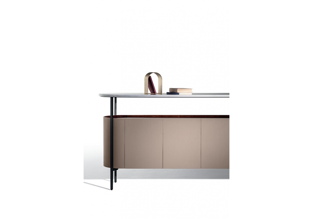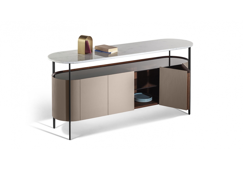 Mi von Neri und Hu für Poltrona Frau entworfen, ist ein Aufbewahrungsmöbel mit einer Struktur bestehend aus gebogenen Paneelen aus Pappelsperrholz, während die Böden und Rückseiten aus Birkensperrholz sind, die alle auf einem Metallrahmen mit brüniertem Stahlfinish montiert sind. Die Türen bestehen aus Wabenplatten mit einem Birkensperrholzrahmen, der mit Waben gefüllt und mit MDF-Platten gepolstert ist. Die Möbel sind innen und unten mit Nussbaum Canaletto furniert. Ein massiver Canaletto-Nussbaumrahmen veredelt die gesamte obere Kante. Die Schrankplatte ist aus gehärtetem Glas, während die erhöhte Platte aus Marmor besteht.