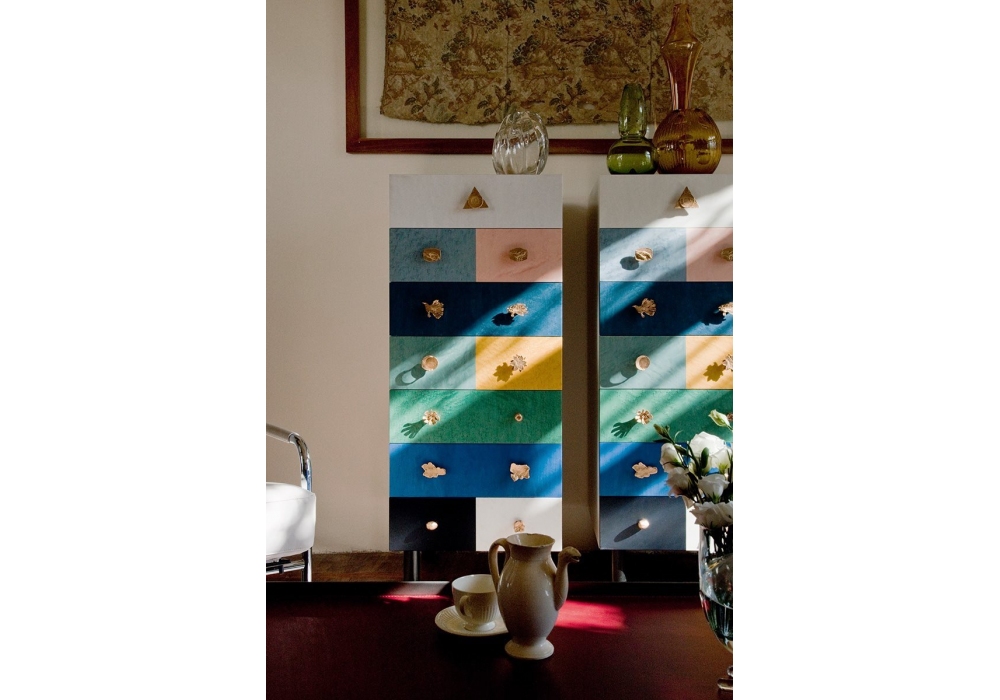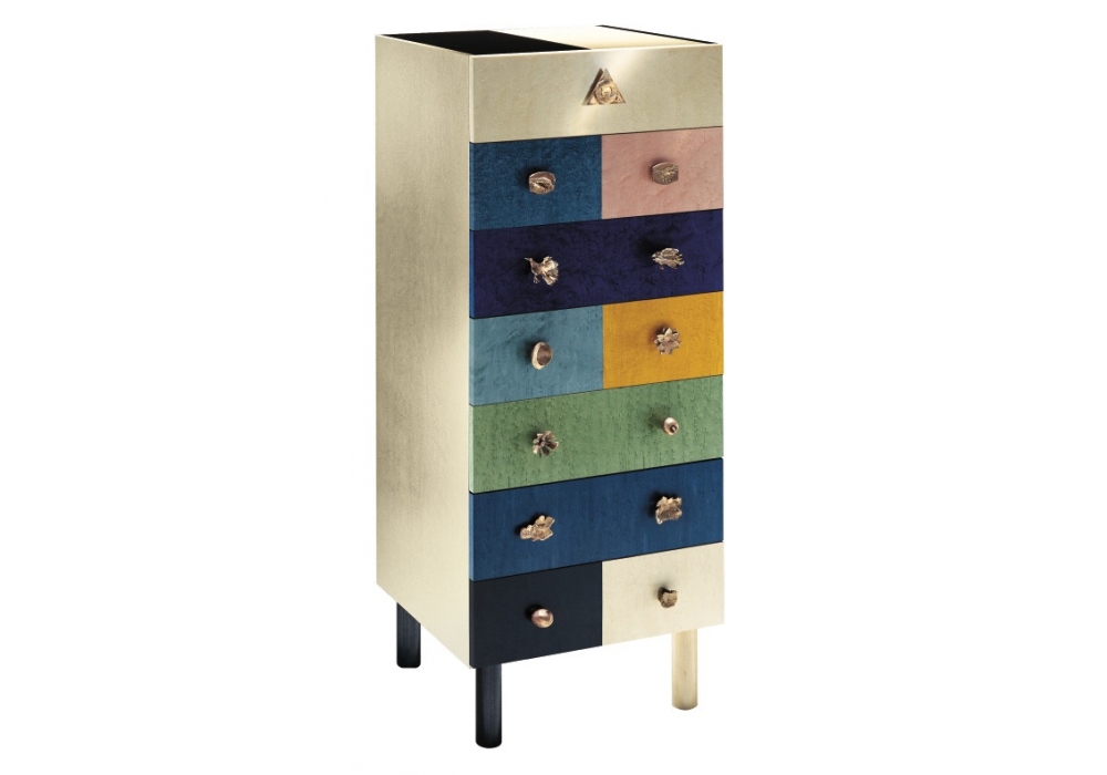 7810 Genesio von Alik Cavaliere für Zanotta Edizioni entworfen, ist eine Kommode mit Holzstruktur furniert in Bruyere in verschiedenen Farben. Bronzegussgriffe, die Genesis darstellen.