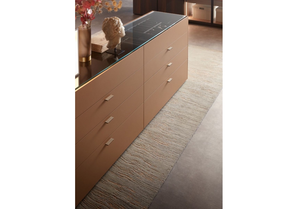 Isola Con Teca von David Lopez Quincoces für Lema entworfen, ist eine Sammlung von Behältern in verschiedenen Größen, sie haben eine Glasplatte und eine Schublade für die Aufbewahrung von Kunstleder-Trennteilen: Schmuckkästchen, Ringe, Armbänder, Uhren und Accessoires, die frei aufbewahrt werden können positioniert, um echte kundenspezifische Displays mit einem anspruchsvollen ästhetischen Wert zu bilden. Die einzelnen Elemente lassen sich mit dem Container mit Sitz kombinieren, um neue Gestaltungskonzepte einer Multifunktionsinsel zwischen geschlossenem Container, Sitz, Vitrine, Schubladen, Kommoden, Fächern mit Türen und Regalen zu bilden.