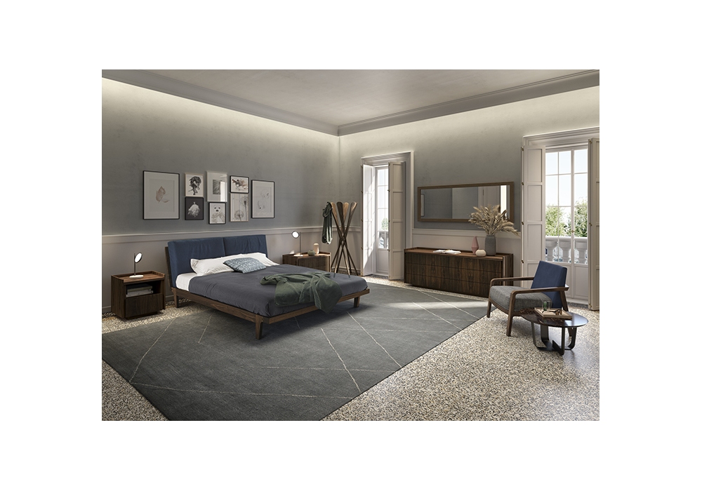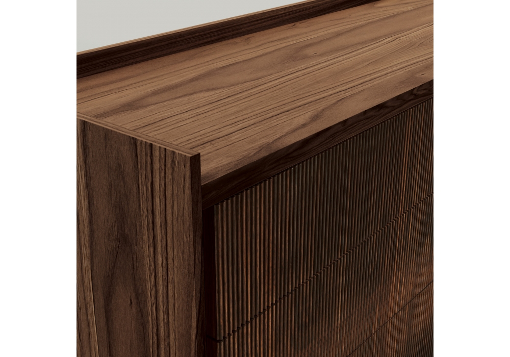 Revo Night Dresser von Giuliano Cappelletti für Riva 1920 entworfen, ist eine Kommode aus Tischlerplatte und Massivholz, gekennzeichnet durch einen Rahmen, der die Platte enthält, mit internen Schubladen mit traditioneller Schwalbenschwanzverbindung. Die besondere vertikale Verarbeitung der Fronten der Schubladen Fresart erzeugt einen modernen und dynamischen geometrischen Effekt.