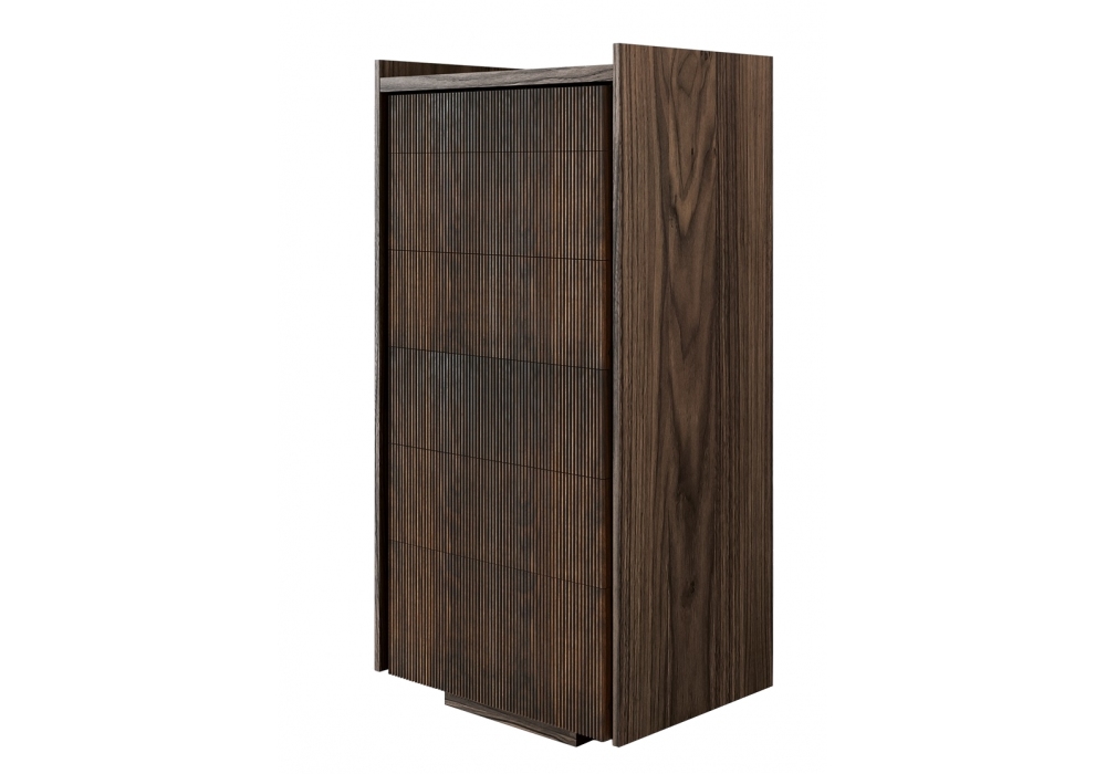 Revo Tower von Giuliano Cappelletti für Riva 1920 entworfen, ist eine Kommode aus Massivholz und Tischlerplatte, gekennzeichnet durch einen Rahmen, der die Platte enthält. Schubladen in verschiedenen Höhen, mit Schwalbenschwanzverbindungen montiert. Die besondere vertikale Verarbeitung der Fronten der Schubladen Fresart erzeugt einen modernen und dynamischen geometrischen Effekt.