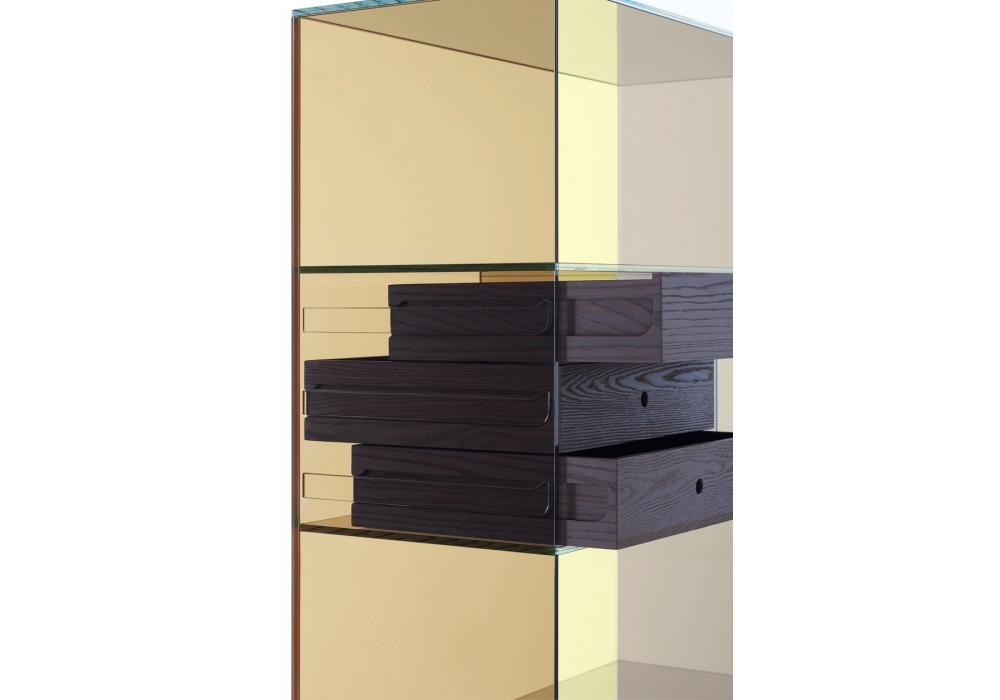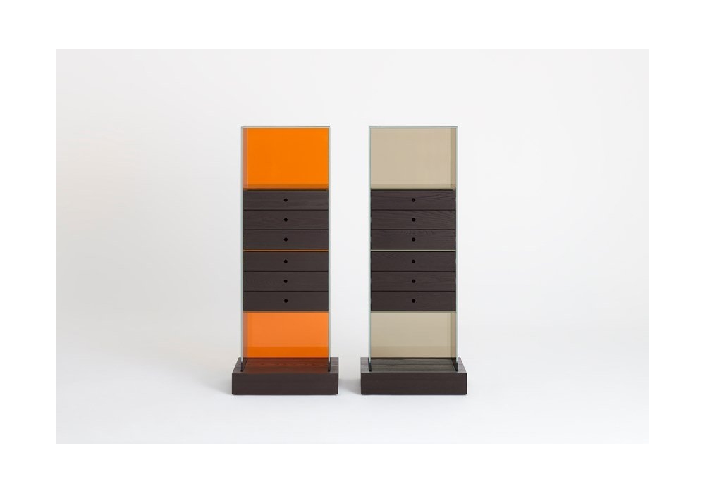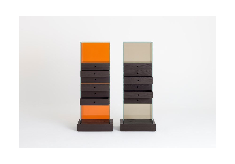 Mandarin, entworfen von Piero Lissoni für Glas Italia, mit Struktur aus geschichtetem Glas, transparent gefärbt, UV-verklebt, Sockel und Schubladen aus massiver dunkler Esche. Lamellen aus Extralight-Glas, die an den Seiten des Möbels geklebt sind, fungieren als „unsichtbare“ Führungen, auf denen die Schubladen gleiten – vollständig freiliegend – dank abgesenkter Rillen an den Seiten.Erhältlich in monochromatischem Glas oder in der Version mit Rückseite in einer anderen Farbe Farbe Unter der Basis befinden sich Räder, die eine einfache Bewegung ermöglichen.