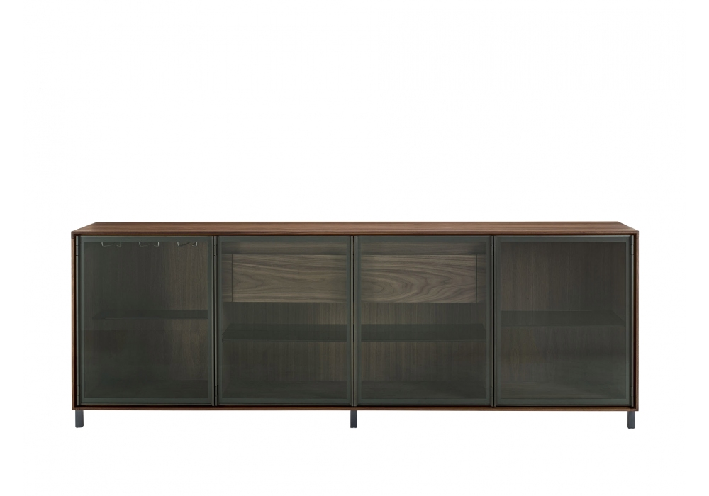 Pandora Glass von Gabriele & Giuliano Cappelletti für Riva 1920 entworfen, ist ein Kommode aus Tischlerplatte mit Glastüren mit Aluminiumstruktur. Die Innenausstattung besteht nur aus Glasböden oder zusätzlich aus zwei innenliegenden Massivholzschubladen mit Griffmulde, die mit Schwalbenschwanzverbindungen verbunden sind. Das Innere des Schranks wird durch LED-Streifen beleuchtet, die auf den mittleren Schultern positioniert sind und deren Zündung automatisch durch Sensoren erfolgt, die beim Öffnen der Türen aktiviert werden.