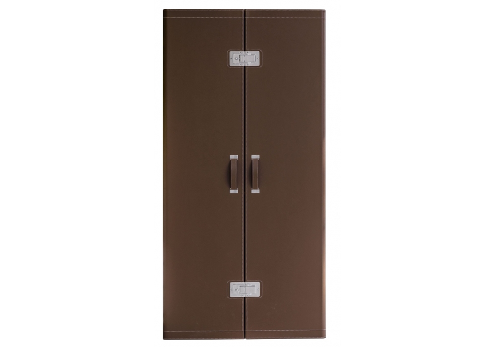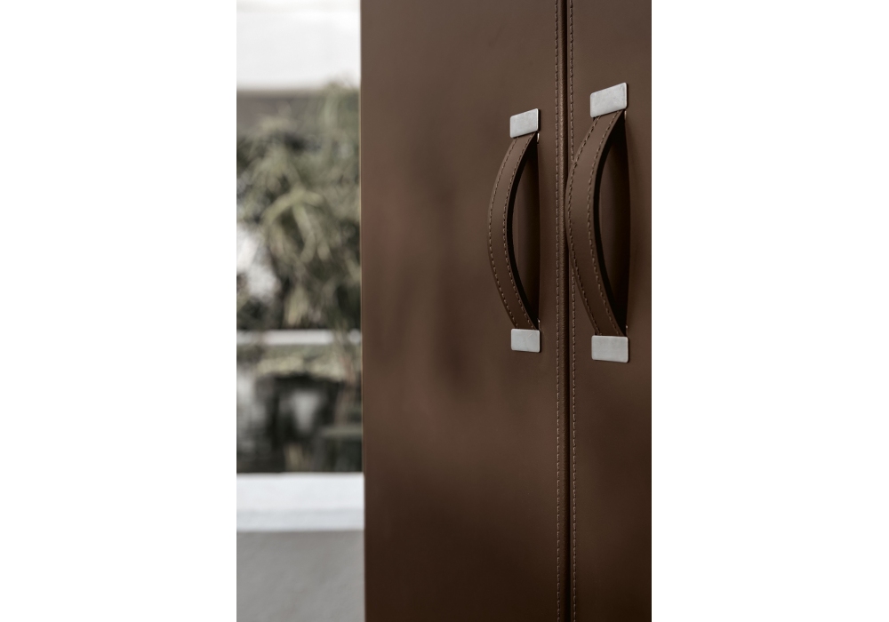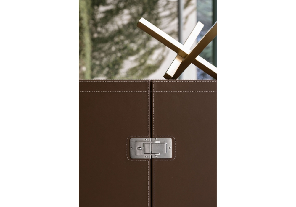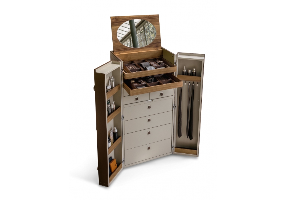 Bombay von Giuseppe Bavuso für Alivar entworfen, ist eine Truhe mit Struktur aus nationalem Nussbaum. Interne Struktur in matt lackierter Leinenfarbe. Außenverkleidung, Griffe, Innenschubladen und ausziehbarer Einlegeboden in Kernleder mit Ziernähten bezogen. Ausgestattet mit hochklappbarem Schminkspiegel, Gürtelhaken und seitlichen Staufächern. Tablett-Kit auf Anfrage bestehend aus: Taschentablett, Ringhaltertablett und Uhrentablett. Verschlussclip aus satiniertem Nickel.