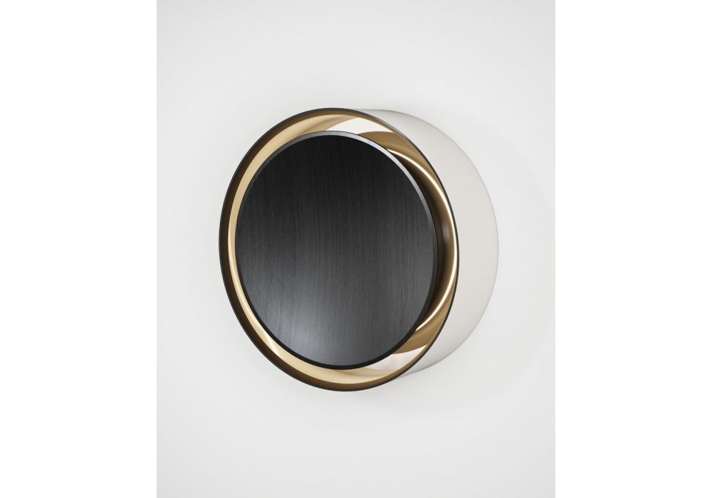 Eclissi, von Elena Pancaldi für Emmemobili entworfen, ist ein Schrank mit Struktur aus schwarz glänzend lackiertem Holz und Außentür aus schwarz gebeizter, sandgestrahlter Eiche. Erhältlich als Einbau- oder Wandversion.