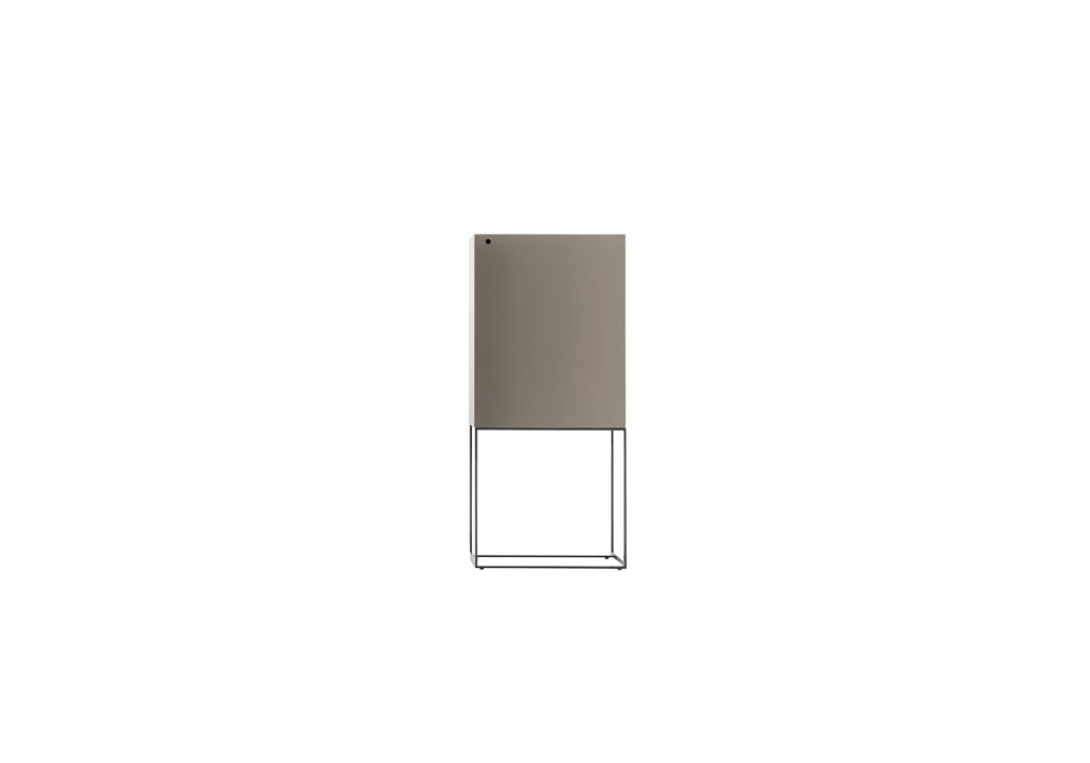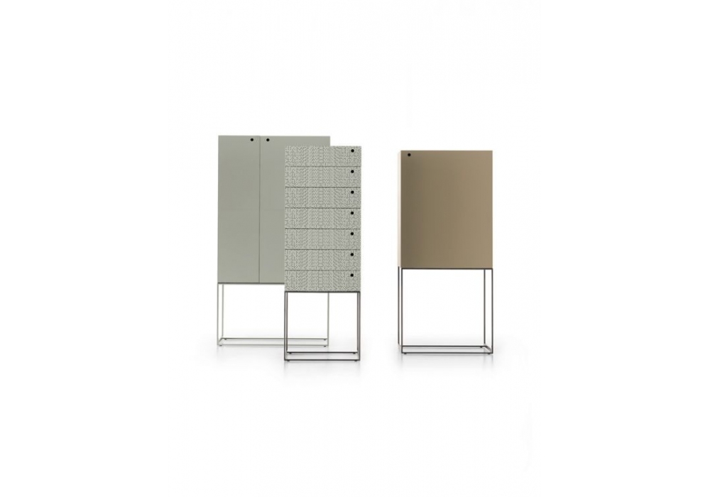 Arabesque entworfen und hergestellt von Ivano Redaelli, ist ein Bar Möbel aus Holz, der mit Vollnarbenleder bezogen oder mit matten oder glänzenden Lacken lackiert ist. Die Basis ist aus bronze- oder nickelfarbenem Metall.