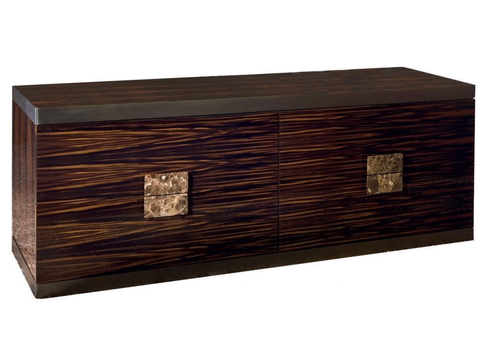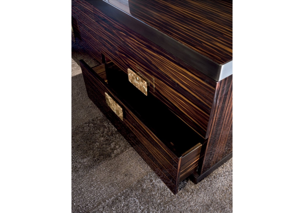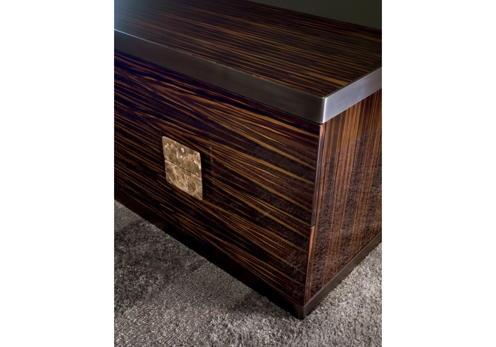 Evelyn von Giuseppe Viganò für Longhi entworfen, ist eine Kommode mit 4 Schubladen, mit Holzstruktur und rektifiziertem Metallrahmen. Behandelt die verschiedenen Murmeln. Die Schubladen können mit Leder bezogen werden.