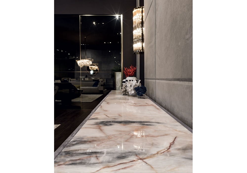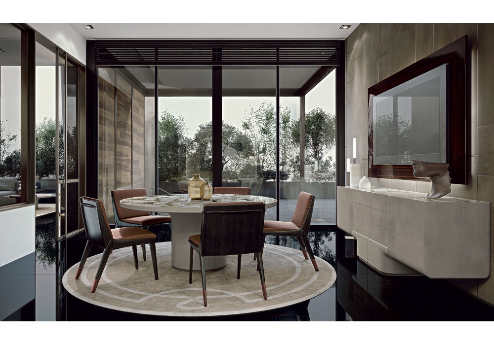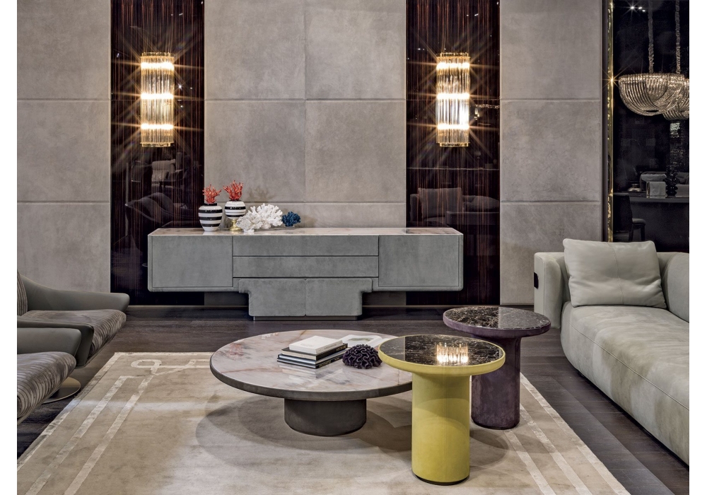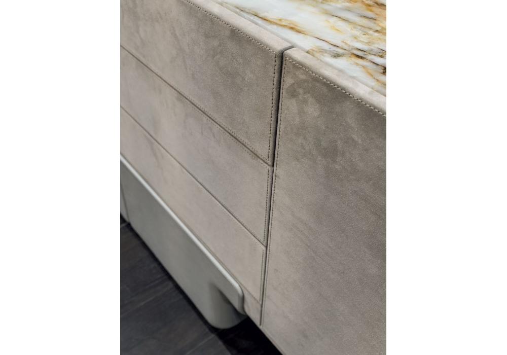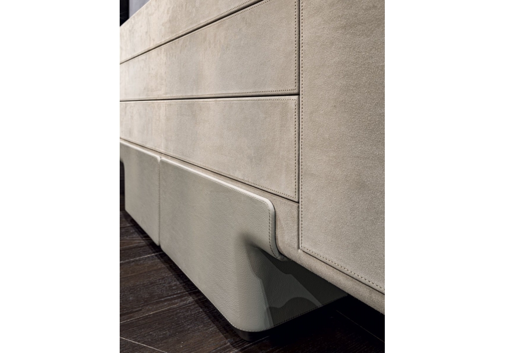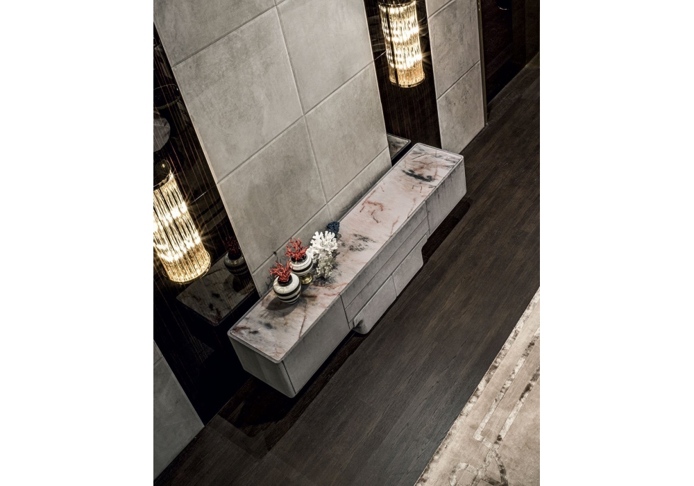 Do von Ben Wu für Longhi entworfen, ist ein Möbel Container aus gemahlenem Metall, Struktur aus MDF mit Lederbezug und Platte aus Spiegel, Marmor oder Holzfurnier. Verfügbar in der niedrigen Version mit zwei Klapptüren und zwei Schubladen oder in der hohen Version mit zwei Türen und 3 Schubladen.