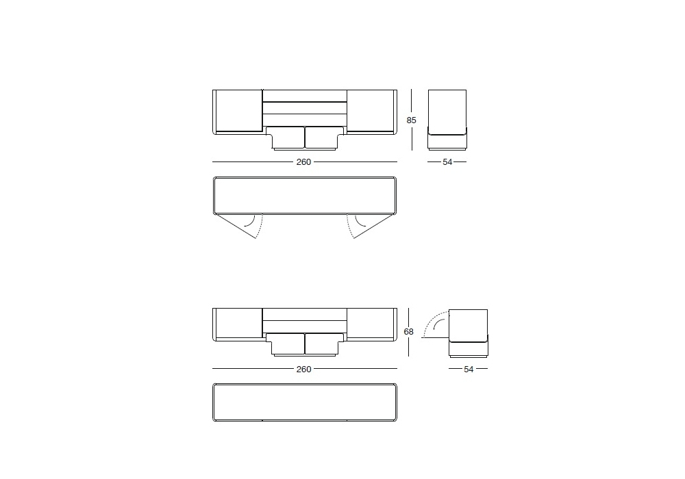 | Abmessungen | 260 x 54 x H 85 cm; 260 x 54 x H 68 cm. |