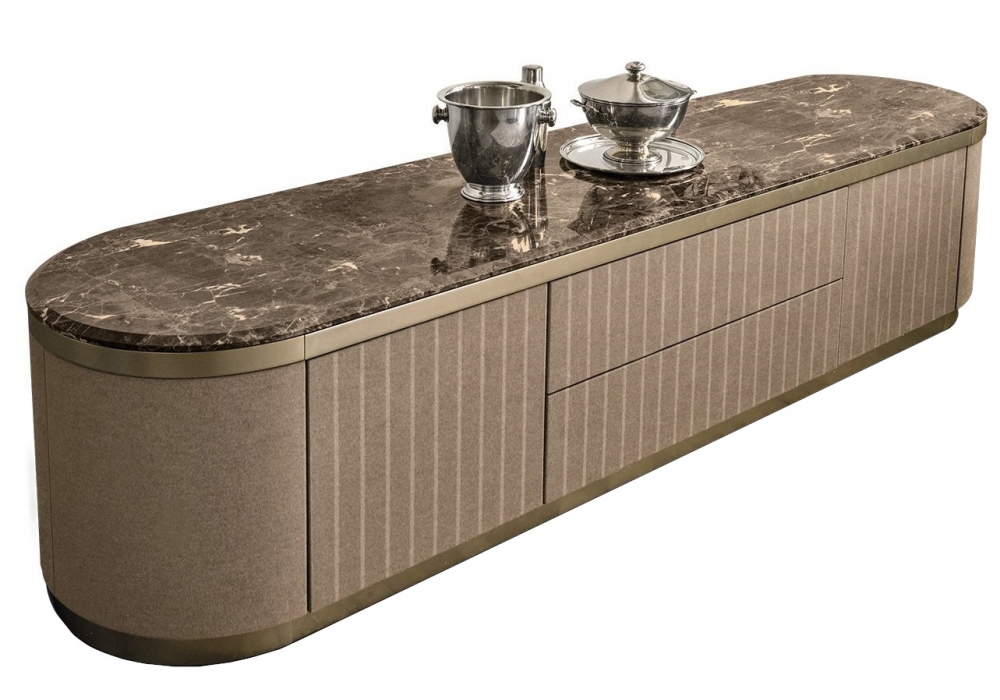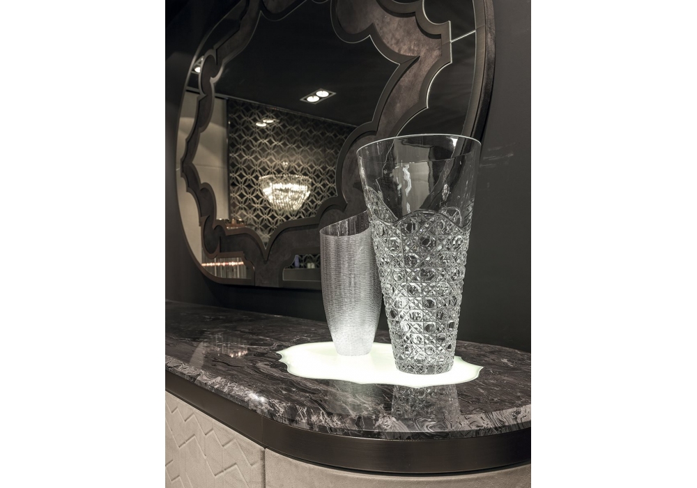 Gordon von Giuseppe Iasparra für Longhi entworfen, ist ein Möbel Container mit Basis und Kanten aus gemahlenem Metall, Platte aus Spiegel oder Marmor und Polsterung aus Leder oder Kaschmir. Innenausstattung aus dunkel gebeiztem Zebrano-Holz. Das hinterleuchtete Oberteil kann als Zubehör hinzugefügt werden. Verügbar in der Version mit glatter Beschichtung oder mit Reliefdekor.