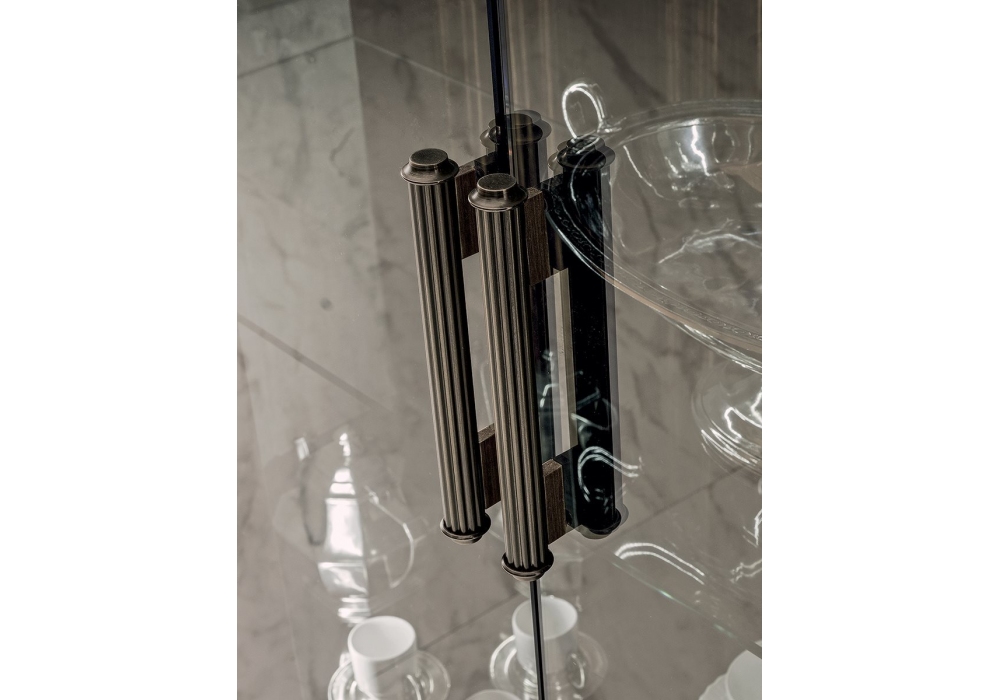 Kate von Giuseppe Iasparra für Longhi entworfen, ist ein Hoch-Möbel mit Innenstruktur und Platte aus furniertem Holz. Geschwungene Seiten mit Lederbezug und Türen aus StopSol-Hartglas in Bronze oder Rauchglas. Geriffelte Metallgriffe und Metallteile in glänzender oder matter Ausführung.