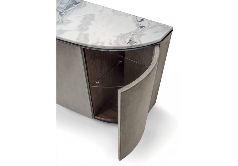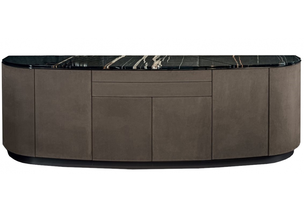 Keope von Giuseppe Viganò für Longhi entworfen, ist ein Schrank mit Möbel Container und Schubladen mit Push-and-Pull-Öffnung. Struktur mit Leder bezogen und Innenausstattung aus dunkel gebeiztem Zebrano-Holz. Bronze lackierter Sockel und dreiteilige Platte aus Marmor oder Holz. Zwischen der Platte und der Schrankstruktur befindet sich eine Metallplatte mit glänzender oder matter Oberfläche. Auf Wunsch zweifarbiges Oberteil.