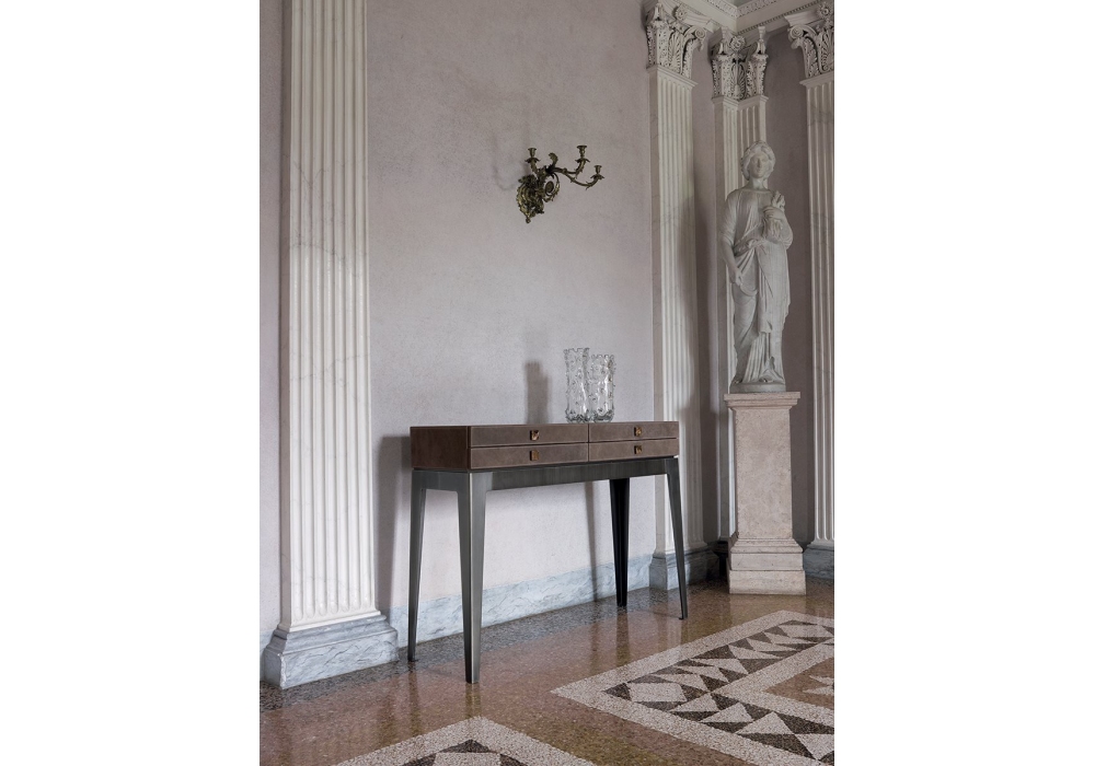 Lady von Giuseppe Viganò für longhi entworfen, ist eine Möbel mit Schubladen. Mit Leder oder Kaschmir überzogene Struktur mit Griffen aus Marmor und Sockel aus lasergeschnittenem, geschliffenem Metall. Die Version mit Holzstruktur ist auf Anfrage verfügbar.