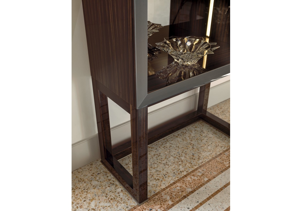 Orwell Von Giuseppe Viganò für Longhi entworfen, ist ein Hoch-Möbel mit Basis und Rahmen aus geschliffenem Metall, Struktur aus furniertem oder glänzend lackiertem Holz und mit Leder oder Kaschmir bezogener Mitteltür. Griff aus Marmor. An den Seiten der Rückenlehne befinden sich zwei dimmbare LED-Streifen mit berührungsempfindlicher Zündung, die das Innere des Möbelstücks beleuchten.