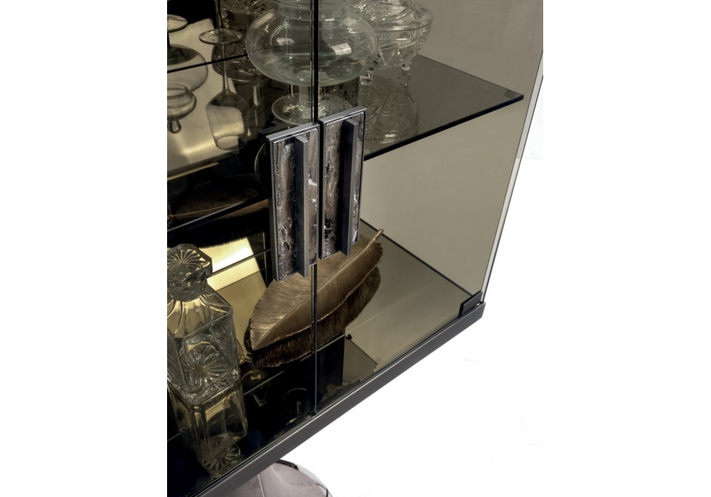 Oscar von Giuseppe Viganò für Longhi entworfen, ist ein Hoch-Möbel mit hyperboloider Säule aus Fiberglas mit Innenstruktur aus lackiertem Metall und Außenbezug aus Leder. Metallteile in glänzender oder matter Ausführung und Struktur in Bronze oder Rauchglas oder Holzessenz. Metallgriff mit Marmoreinsatz. Beleuchtung über dimmbare LED-Streifen mit berührungsempfindlicher Zündung. Auf Anfrage ist die Version mit Holzstruktur und lederbezogenen Türen verfügbar.