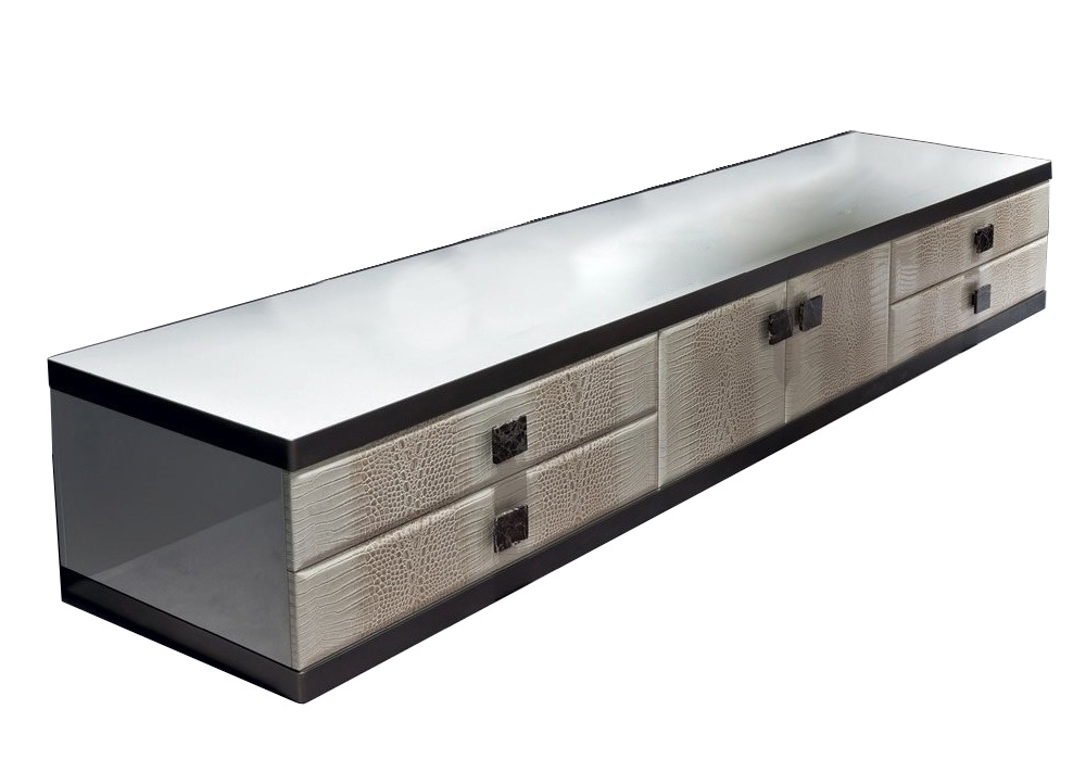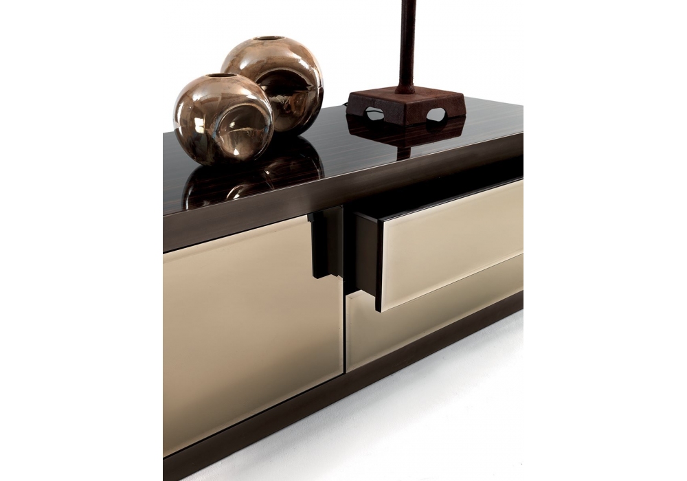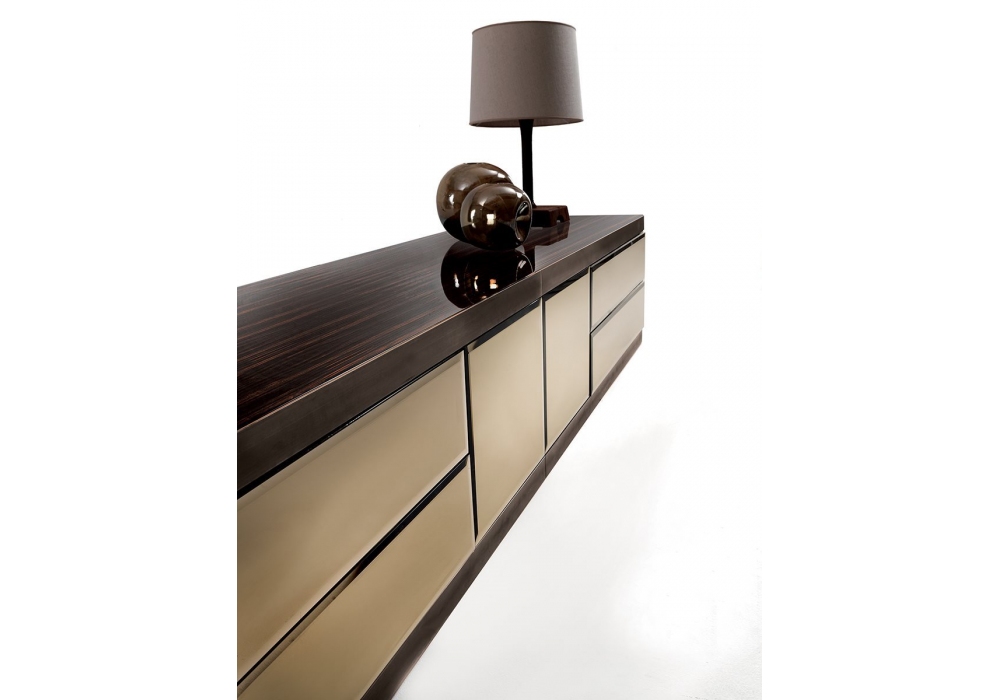 Aspen von Giuseppe Viganò für Longhi entworfen, ist eine Möbel Container mit Metallteilen (Basis und Unterkante) aus geschliffenem Metall, Struktur aus glänzend lackiertem Holz und Fronten aus Leder. Marmor- oder Spiegelplatte. Auf Anfrage ist es mit einer kompletten Holzstruktur verfügbar.