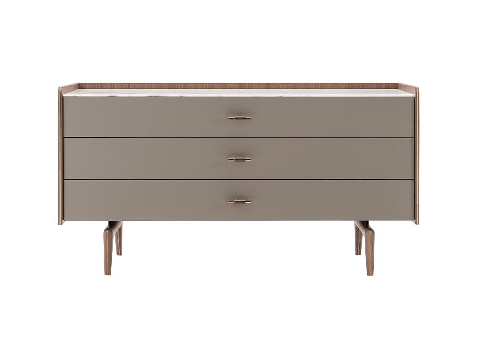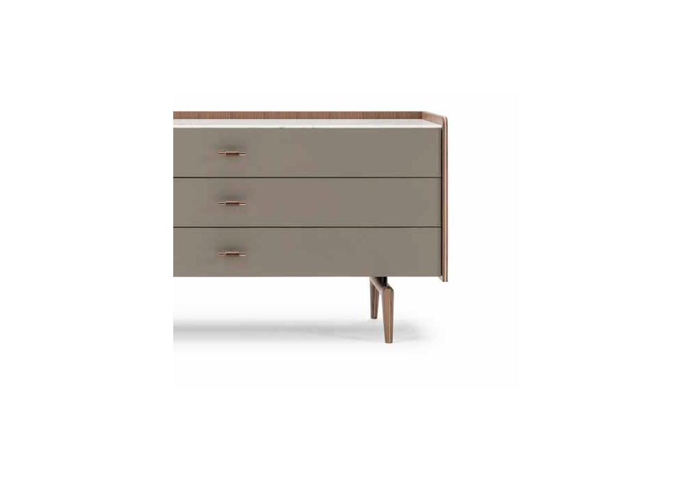 Blues von Giuseppe Viganò für Turri entworfen, ist eine Kommode mit Struktur aus furniertem Nussbaumholz und Beinen aus massivem Nussbaum. Die Fronten können aus furniertem Nussbaumholz oder mit Leder bezogen sein. Platte aus Marmor, Leder oder Nussbaum furniert.