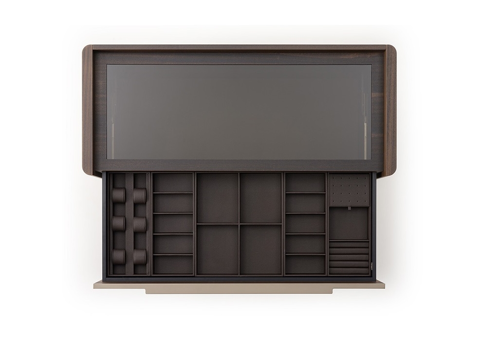 Domus von Matteo Nunziati für Turri entworfen, ist eine Kommode mit Struktur aus MDF und Spanplatten mit wärmebehandeltem Eukalyptusfurnier. Platte aus Glas oder Holz. Es ist möglich, Zubehör für Schubladen hinzuzufügen.