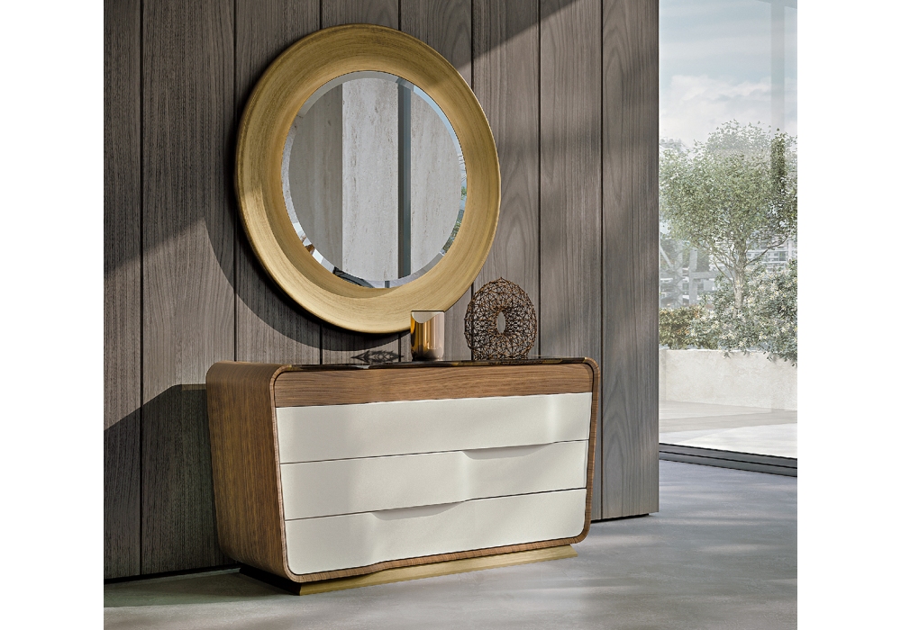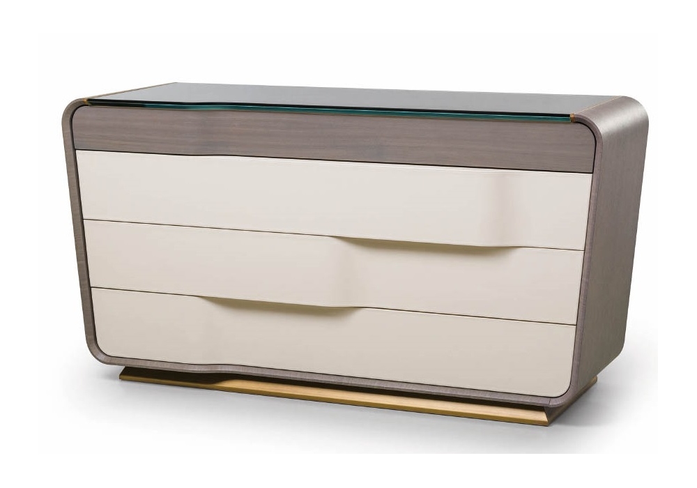 Melting Light von Frank Jiang für Turri entworfen, ist eine Kommode mit Struktur aus MDF, Sperrholz, massivem Nussbaum und nussbaumfurnierten Spanplatten. Die Oberseite besteht aus bronziertem Glas. Es gibt drei mit Mikrofaser ausgekleidete Schubladen, während die obere einen Objekt-/Krawattenhalter aus Holz hat. Polsterung in verschiedenen Ledern. Optional kann eine LED-Beleuchtung hinzugefügt werden.
