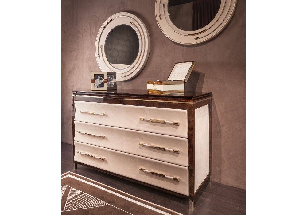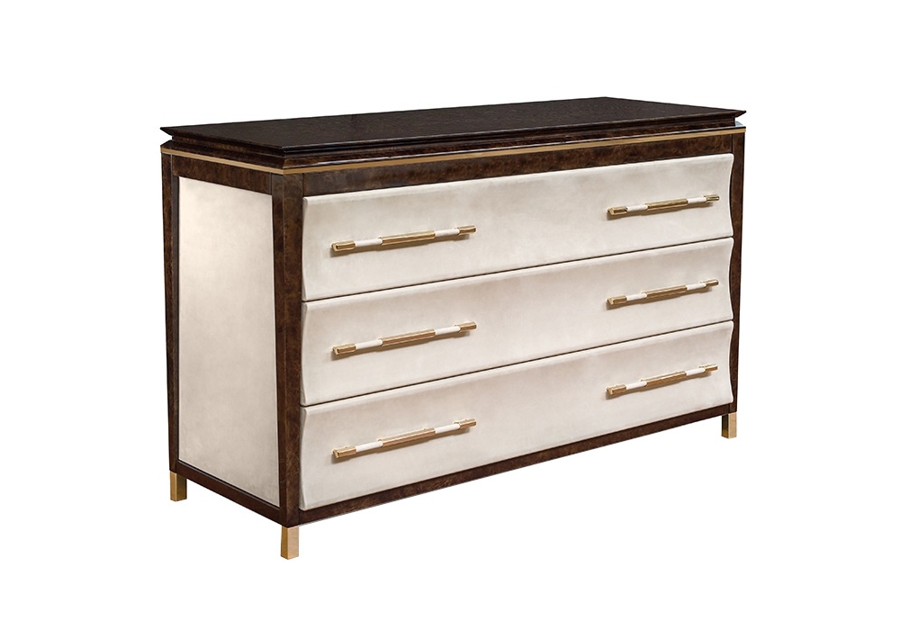 Noir von Andrea Bonini für Turri entworfen, ist eine Kommode mit Struktur aus MDF und Spanplatten in glänzend lackierter Ausführung, Lederbezug und Platte aus Marmor oder Holz. Es gibt drei Schubladen mit Mikrofaserfutter. Füße und Metallteile in verschiedenen Ausführungen.