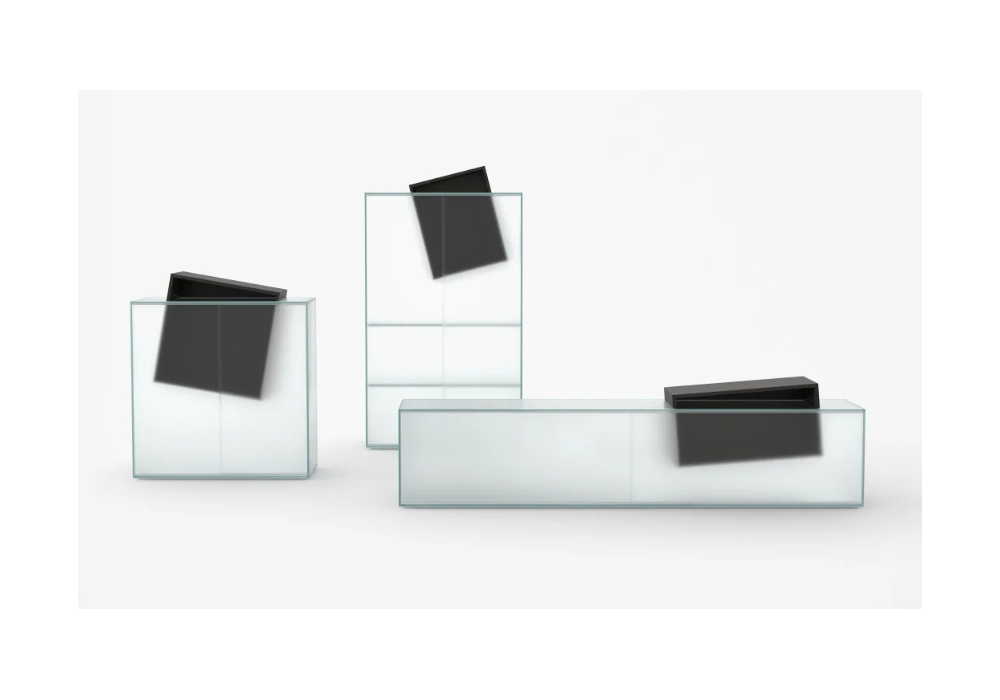 Drift, von Nendo für Glas Italia entworfen, ist ein Aufbewahrungsmöbel mit Schiebetüren aus gehärtetem, extraklarem, geätztem Glas, UV-verklebt. Eine Holzkiste aus schwarzer Eiche mit der Funktion eines Objektfachs wird zerteilt und so am Möbelstück befestigt, dass ein Teil darin verbleibt und der andere auf der Oberseite ruht. Die Türen gleiten in natur eloxierten Aluminiumprofilen. Der silberne Kristall des Sockels verbreitet Helligkeit im Inneren des Möbelstücks. Erhältlich in verschiedenen Größen.