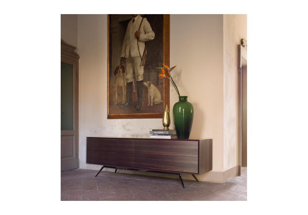 Quarantacinque von Silvano Pierdonà für Capodopera entworfen, ist eine Kommode auf Gitter in matt, glänzend lackierter Ausführung oder in verschiedenen Holzausführungen. Basis aus lackiertem und Metall in verschiedenen Ausführungen.