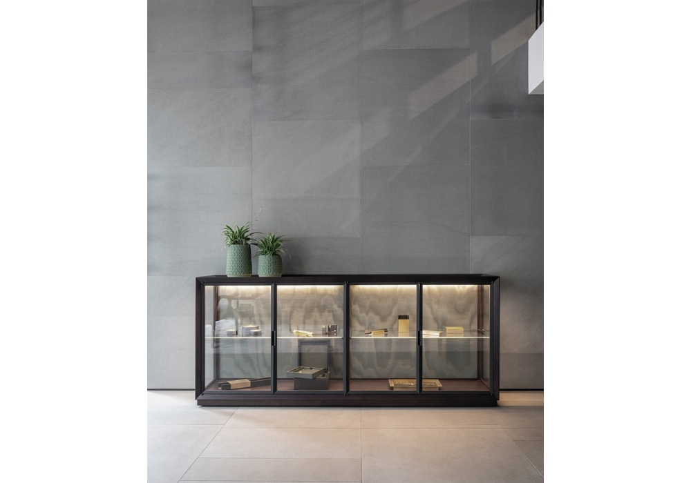 Wonderbox von DRAW Studio für Ceccotti Collezioni entworfen, ist ein Sideboard mit 2 Fächern und 4 ultratransparenten Glastüren. Rahmen aus massivem amerikanischem Walnussholz und Sockel aus furniertem Sperrholz. Transparente Glasplatte und Griffe aus brüniertem Messing. Internes Zubehör auf Anfrage.