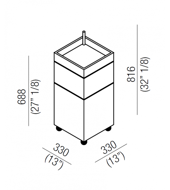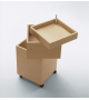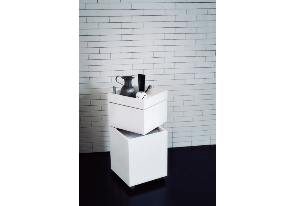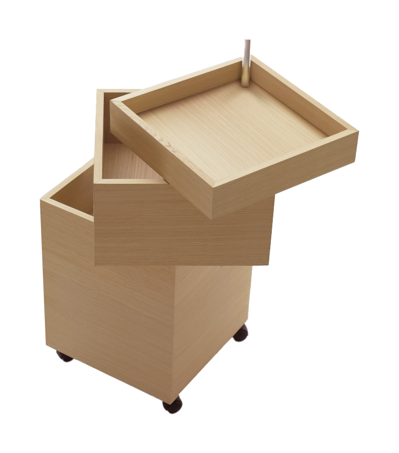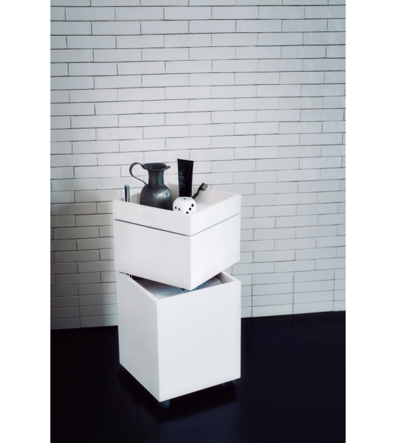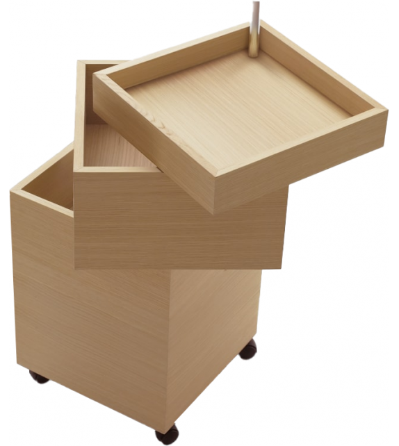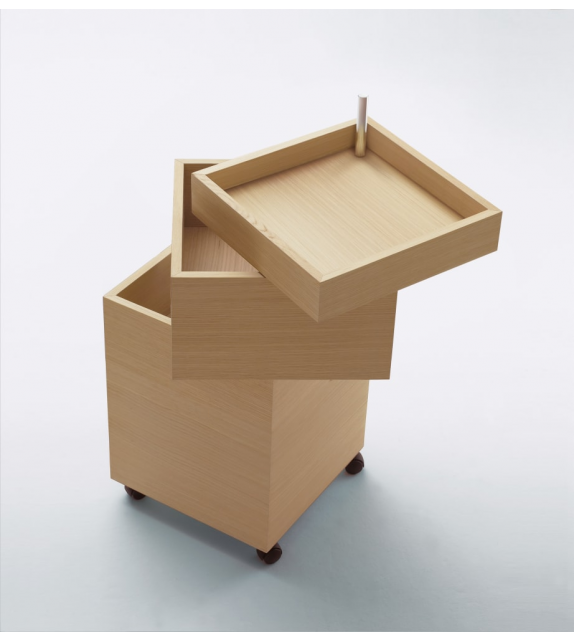 O.J.C. von Benedini Associati für Agape entworfen, ist ein Behälter auf Rollen aus natürlicher, brauner, dunkler Eiche, rekonstituiertem Holz mit Teak-Finish oder weiß oder grau lackiert. Er ist in drei von oben zugängliche Sektoren mit einer drehbaren Öffnung unterteilt. Griff aus verchromtem Messing.