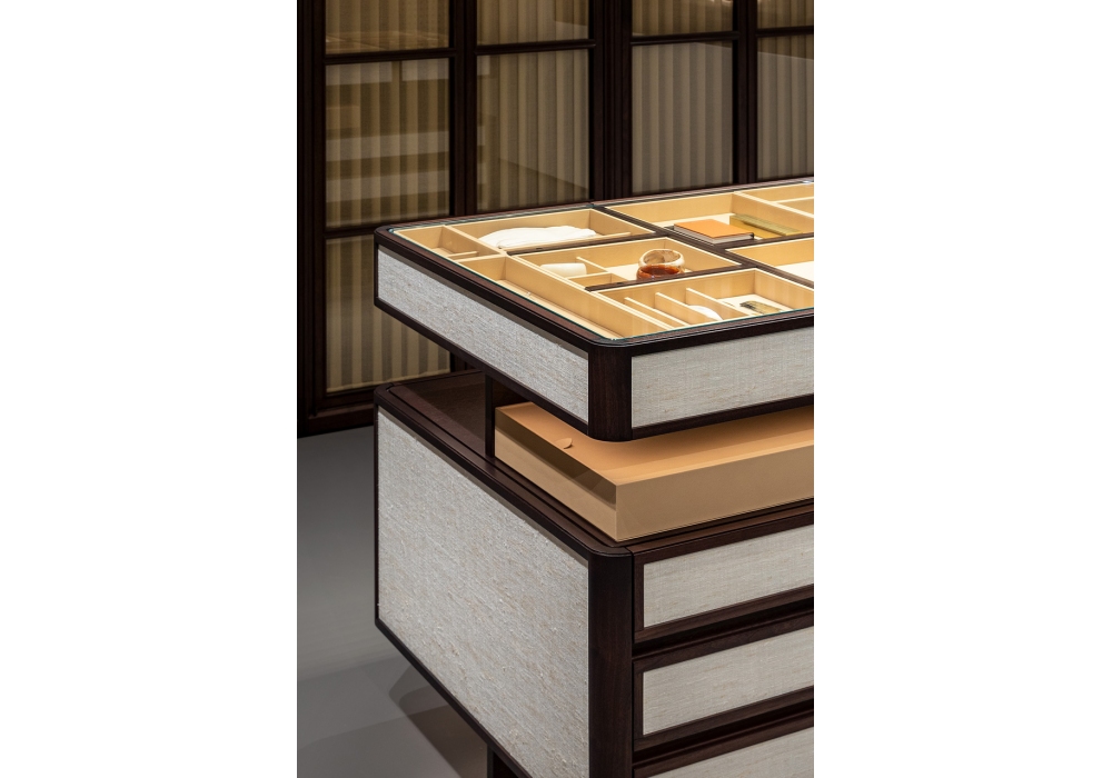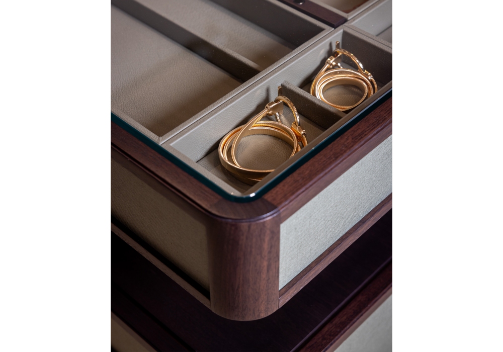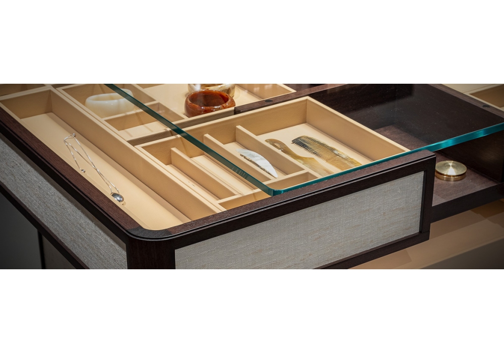 Full Island von Roberto Lazzeroni für Ceccotti Collezoni entworfen, ist eine freistehende Kommode mit einer Struktur aus massivem Nussbaumholz und Front- und Seitenteilen, die mit Stoff, Leder oder in verschiedenen Ausführungen lackiert sind. Die obere Platte besteht aus extraklarem Hartglas. Full Island verfügt über mehrere Schubladen und herausnehmbare Tabletts.