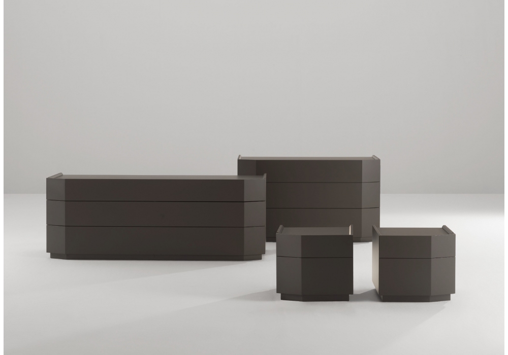 Delineo, entworfen vom R&S Désirée Team, ist eine Kollektion von Aufbewahrungsmöbeln in verschiedenen Größen für den Schlafbereich; sie zeichnet sich durch ein klares und solides Design aus, das sich dezent in jede Umgebung einfügt, mit einem kompakten Volumen, das durch regelmäßige Flächen und Schubladenfronten betont wird, während die Verbindung von geneigten Fronten und Seiten eine praktische integrierte Griffmulde bildet, die die Ästhetik des Produkts definiert und das Öffnen erleichtert.