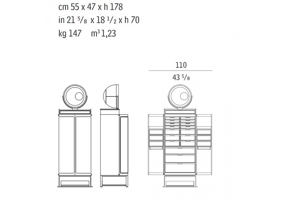 Oro von Chi Wing Lo für Giorgetti entworfen, ist eine hohe Kommode aus Nussbaum Canaletto und Ledereinsätzen, mit Schubladen in drei verschiedenen Größen und zwei Containertüren mit Innenschubladen und einem Sekretär. Oro ist in der Version ohne oder mit Rundspiegel, mit Lupeneinsatz und verstellbarem Winkel erhältlich. Die Metallteile und der Sockel sind aus bronzefarben lackiertem Metall.