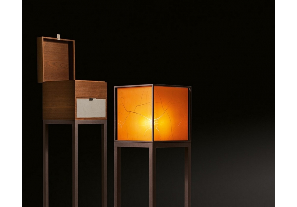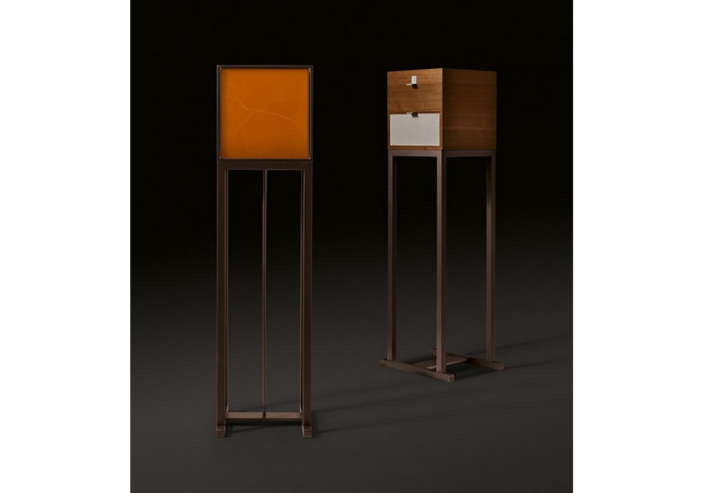 Myo is a stand with a drawer and a flap designed by Chi Wing Lo for Giorgetti. Stand with a drawer and a flap door in walnut canaletto wood and with metal base frame painted with a bronze colour.