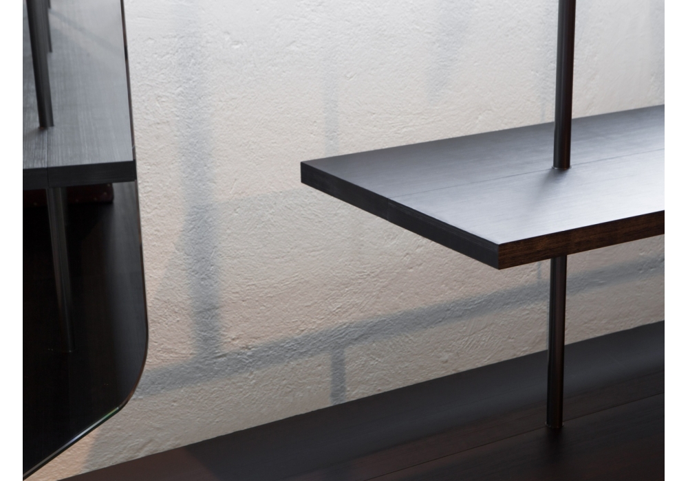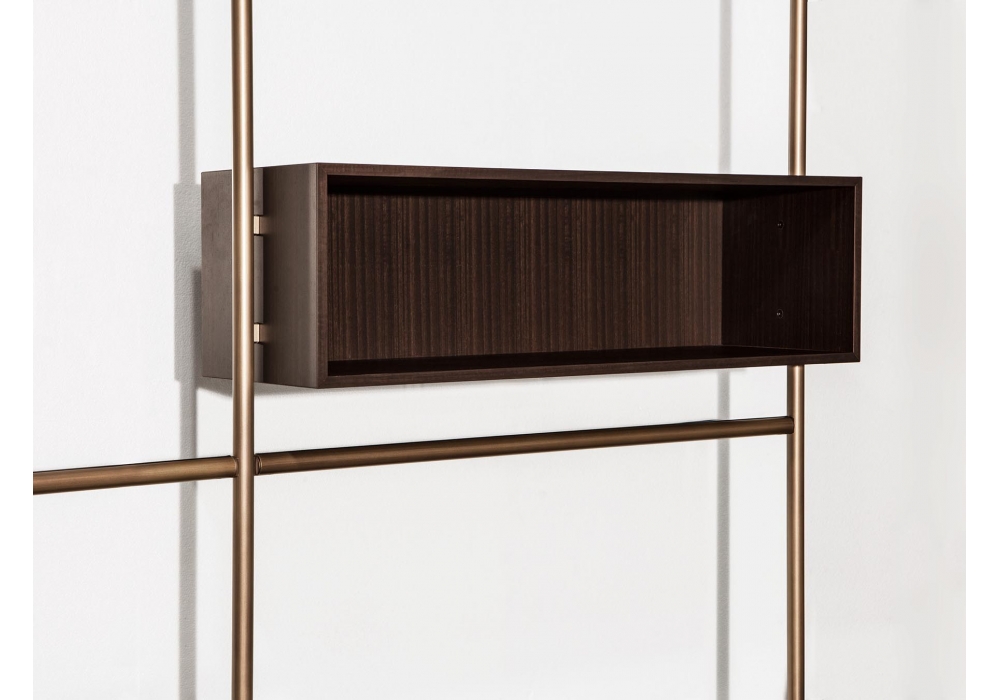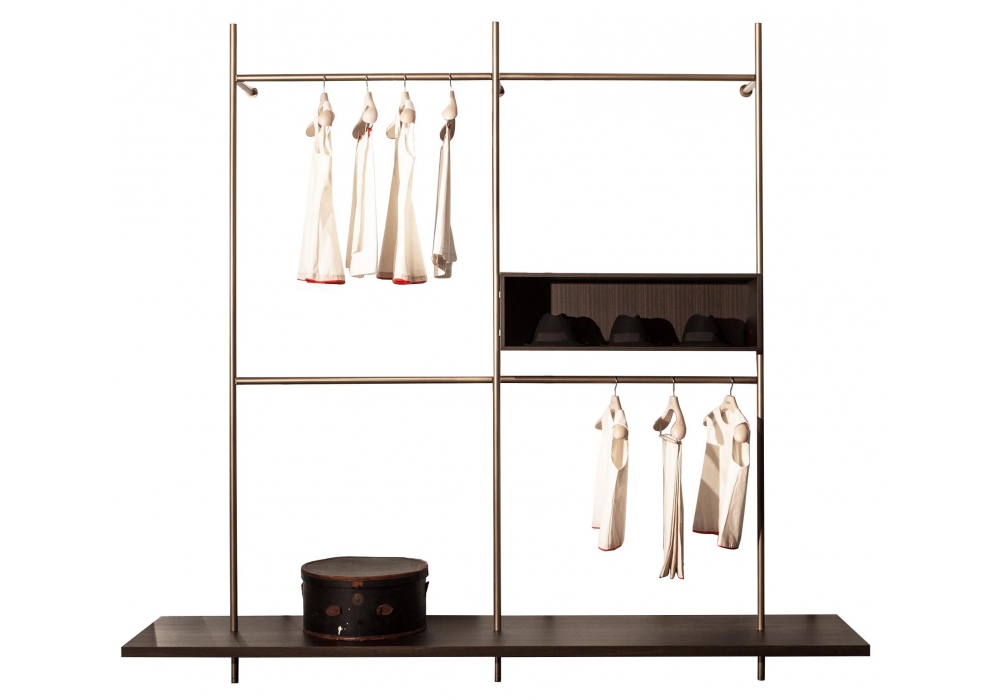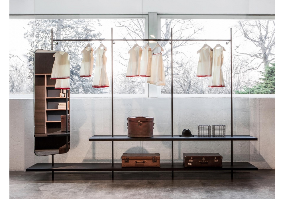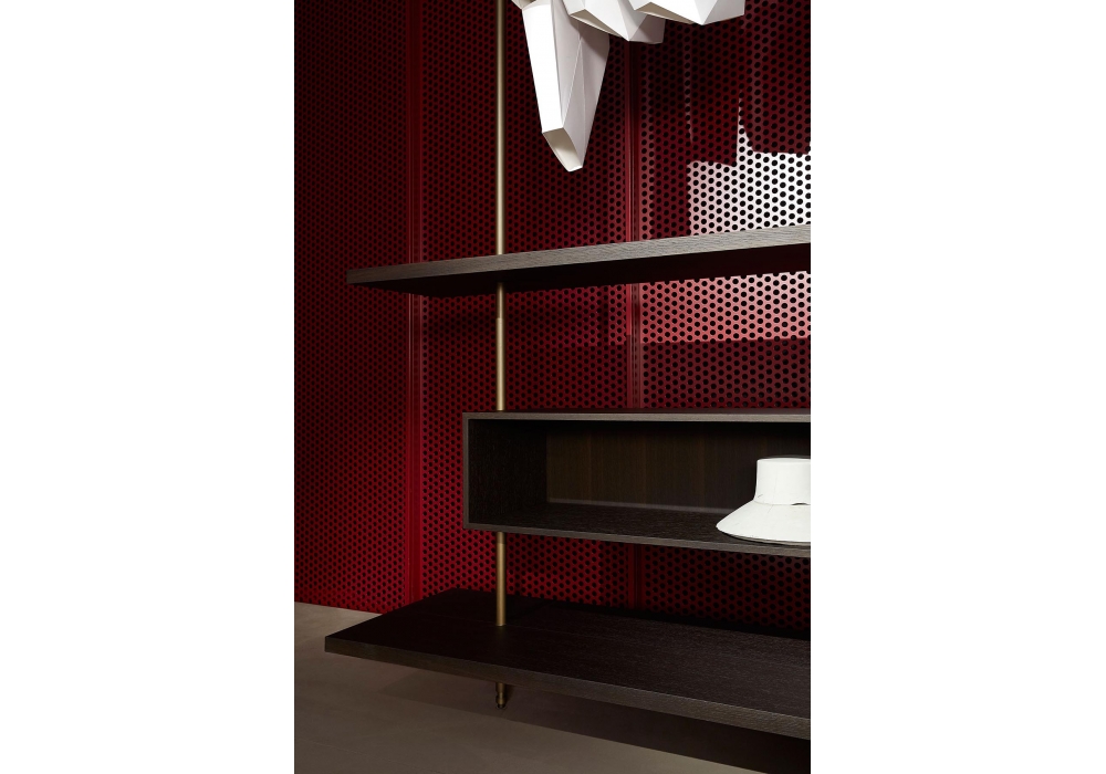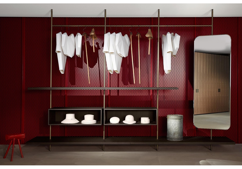 Boutique Mast, von Piero Lissoni für Porro entworfen, ist ein modularer Kleiderschrank mit regalen und modulen aus Holz, verfügbar in verschiedenen Ausführungen. Pfosten und Stangen aus Eisen oder brüniertem Messing. Verfügbar in verschiedenen Konfigurationen.