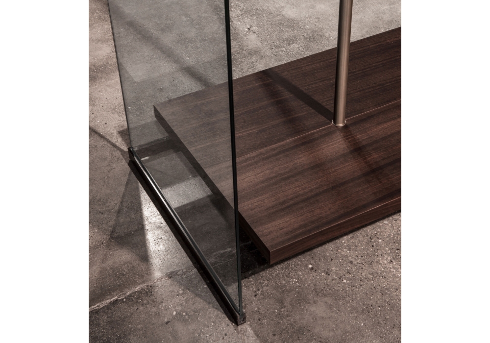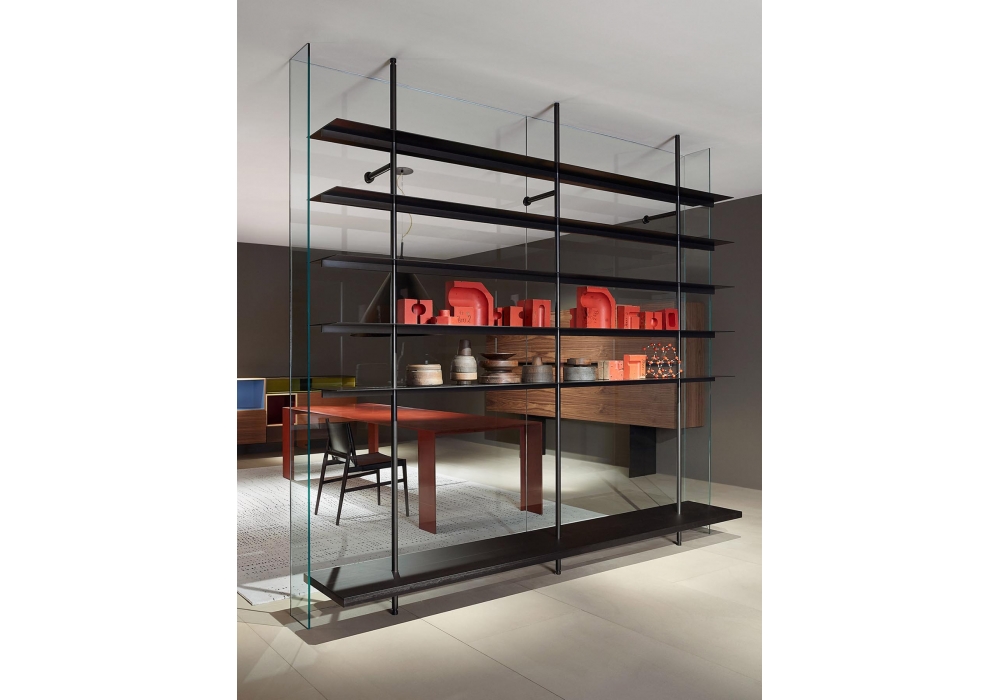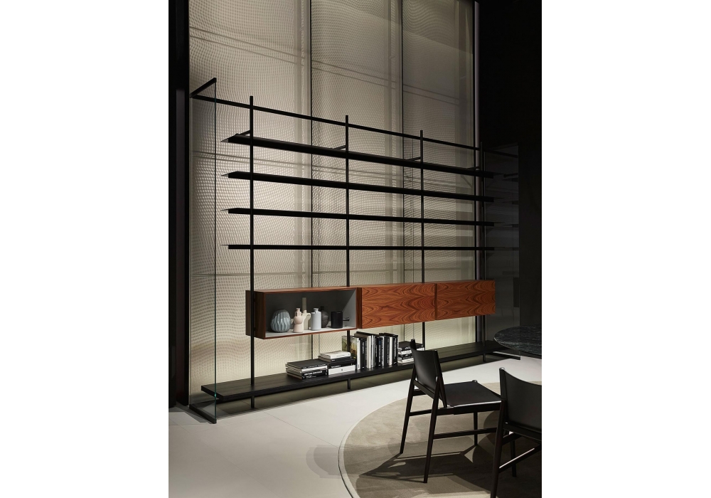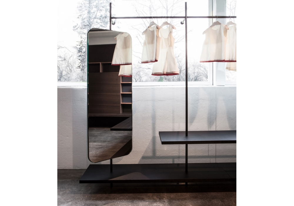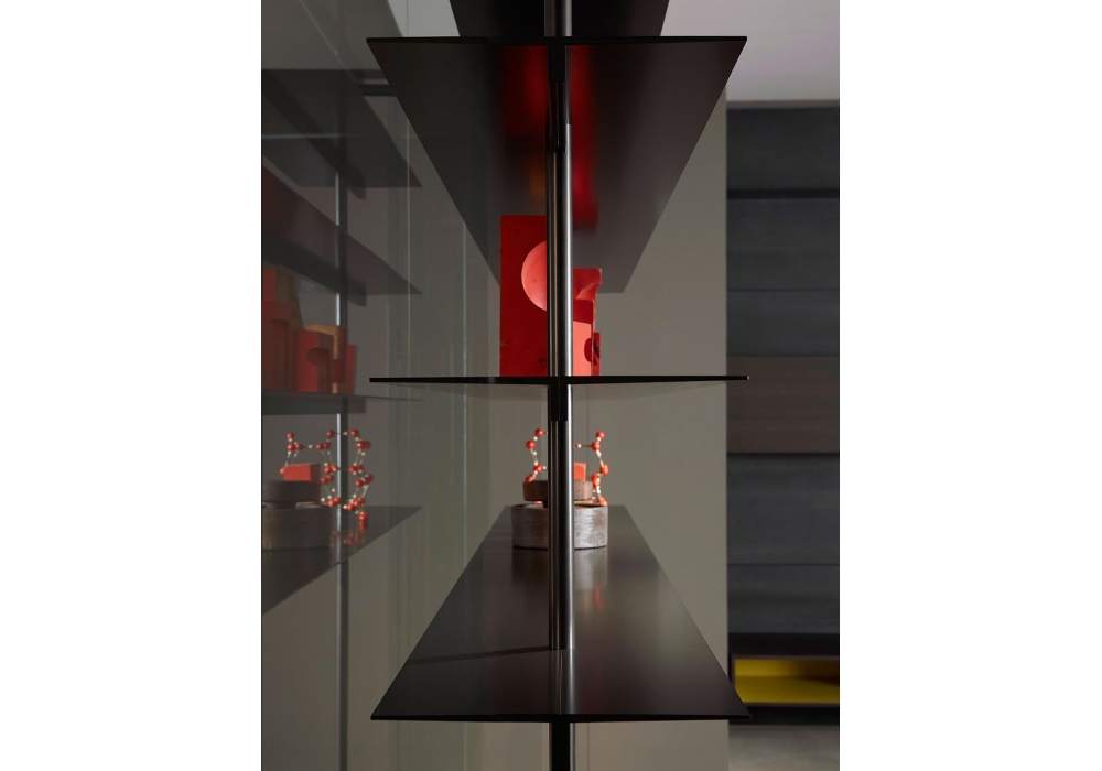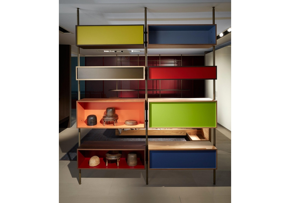 Boutique Mast, von Piero Lissoni für Porro entworfen, ist ein modularer Kleiderschrank mit regalen und modulen aus Holz, verfügbar in verschiedenen Ausführungen. Pfosten und Stangen aus Eisen oder brüniertem Messing. Verfügbar in verschiedenen Konfigurationen.