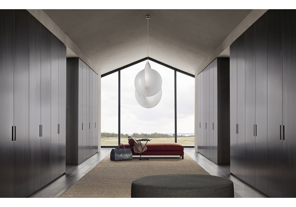 Plus, von R&D Poliform entworfen, ist einer Kleiderschrank mit Türen in Eiche, Nussbaum, schwarzer Ulme oder lackiert. In Klapp- oder Schiebeausführung ist Plus an der Form mit integriertem Griff zu erkennen.