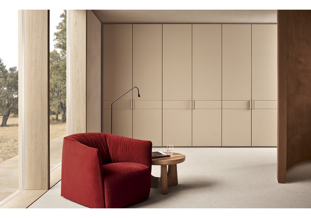 Cover, von R&D Poliform entworfen, ist einer Kleiderschrank mit Türen in Techno-leder, Stoff und Glass. Drehtür und komplanare Tür erhältlich. Profil aus Aluminium lackiert/lackiert matt Farben.