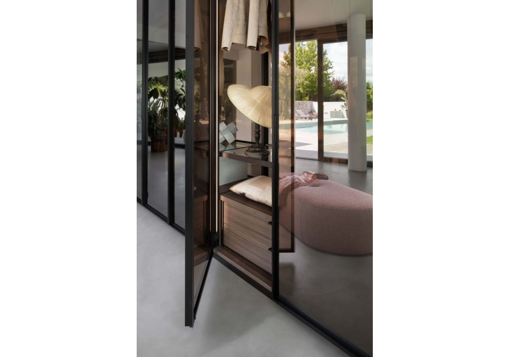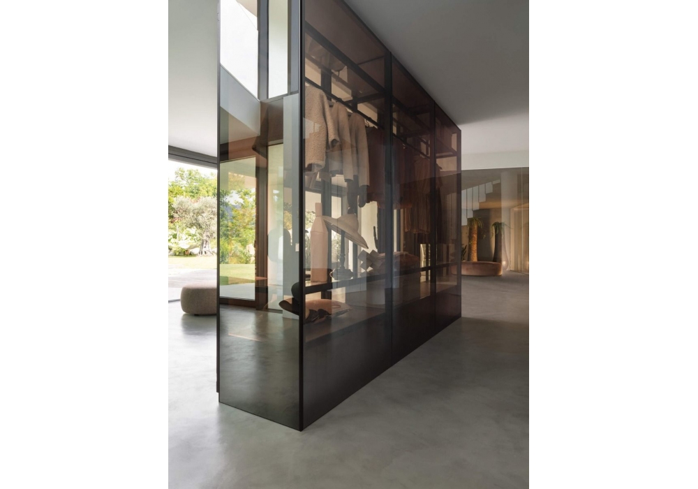 Tian von Lema entworfen, ist ein modularer begehbarer Ankleideraum komplett aus Glas, der mit den Dandy-Drehtüren kombiniert oder auch in der Open-Version ohne Türen angeboten werden kann. Die Innenräume bieten eine große Auswahl an optionalem Zubehör, einschließlich LED-Beleuchtung mit Dimmern an den vorderen vertikalen Pfosten.