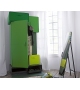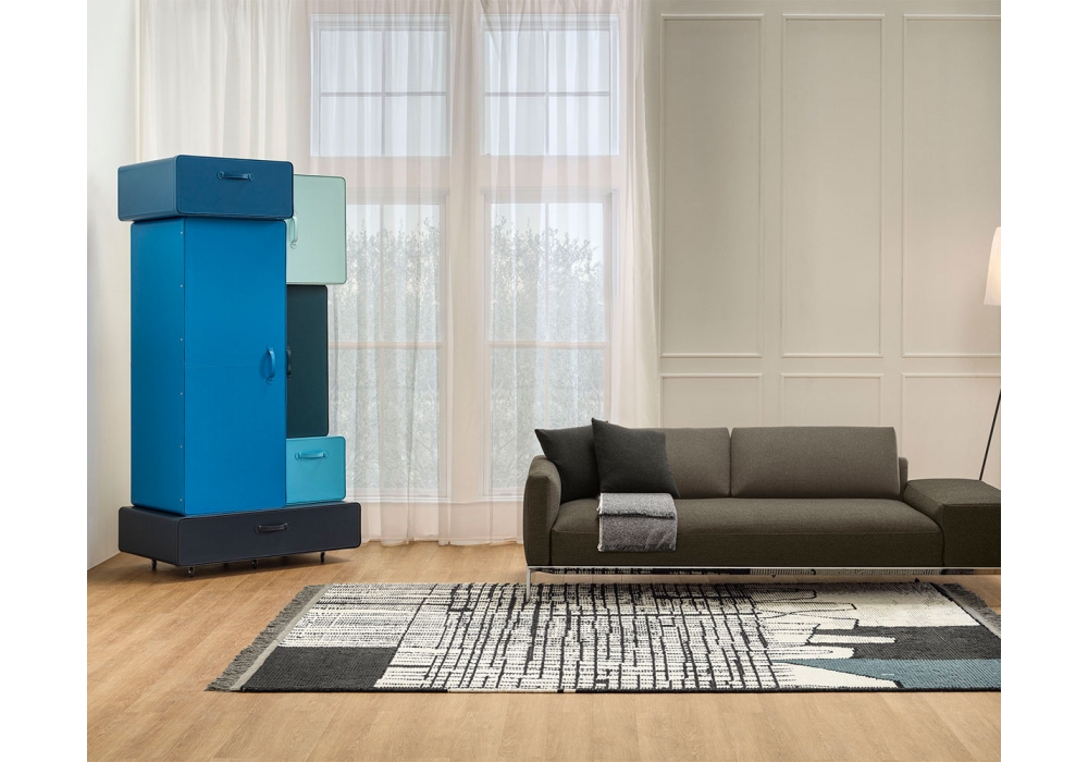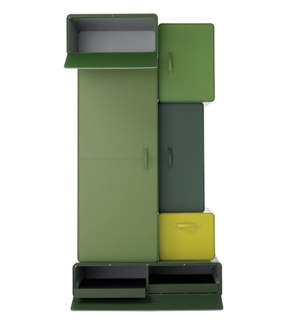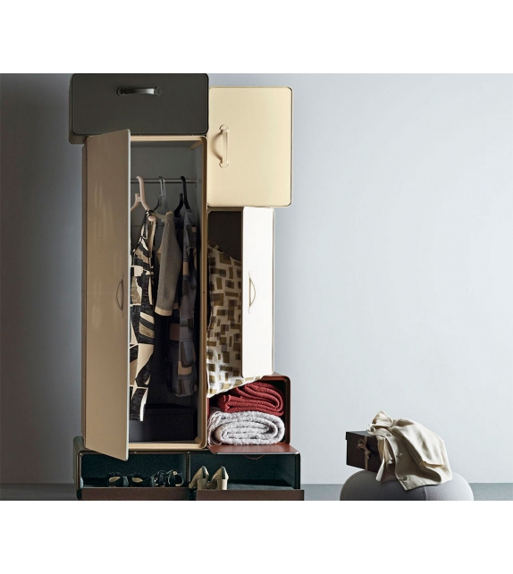Valises von Maarten De Ceulaer für Casamania & Horm entworfen, ist ein Kleiderschrank mit Türen und Korpus aus eichenfurnierten Tannenholzplatten. Die Außenseite der Module ist mit Leder bezogen. Das M2-Modul ist mit einem Regal und einer Kleiderstange ausgestattet. Das M3-Modul ist mit einem Regal ausgestattet. Das M6-Modul ist ein Schuhregal. Der Kleiderschrank wird von einem Rollwagen mit Eichenfurnier getragen, sodass er leicht bewegt werden kann.