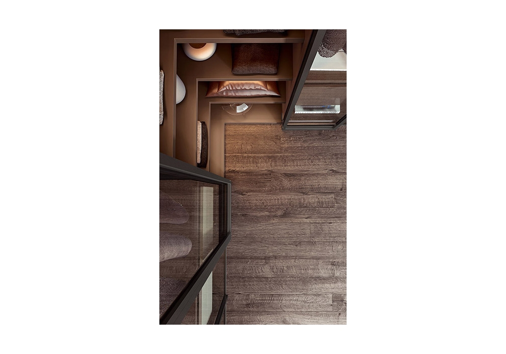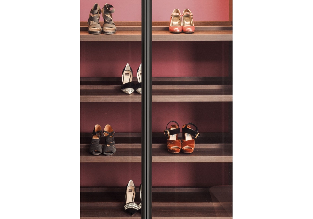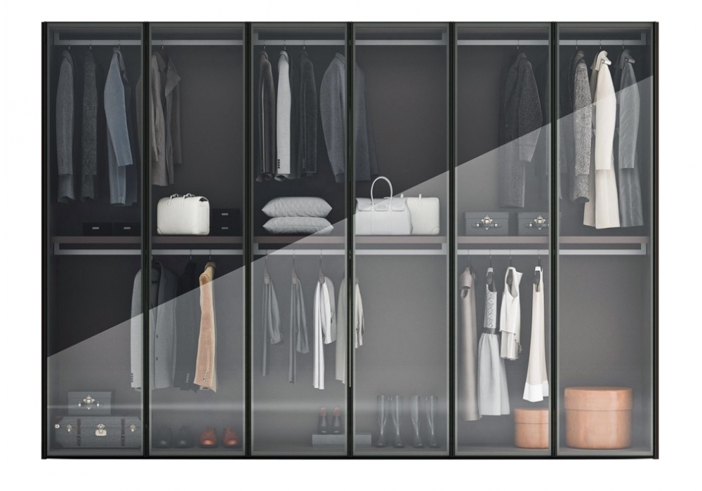 Milano von Pianca entworfen, ist ein modularer Ankleideraum mit Glastüren und lackiertem Rahmen in den Ausführungen Canna di Fucile oder Palladio. Innenausstattung in Mattlack oder Stoff. Scharnieröffnung der Türen, die einen Winkel von 180 ° erreichen können, mit Stiftscharnieren.
