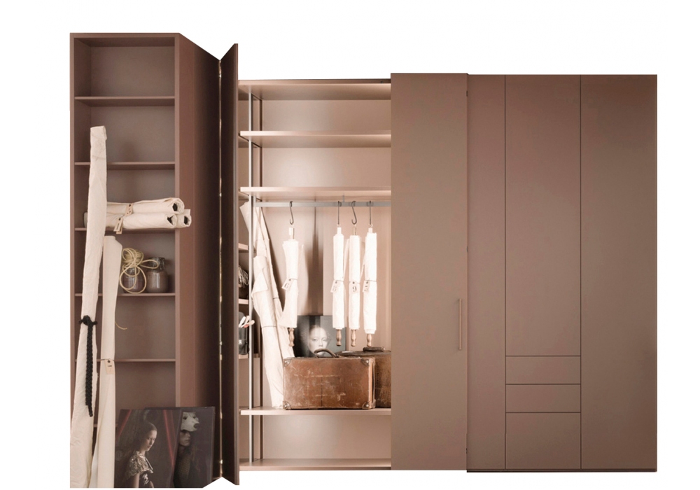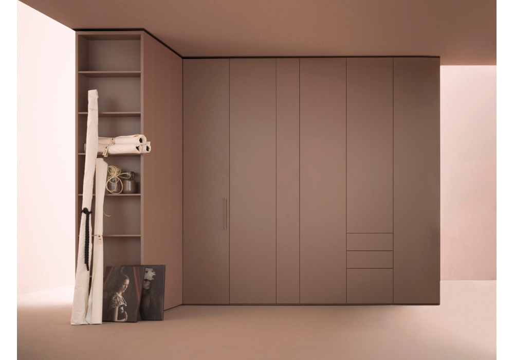 Core von R&D Caccaro für Caccaro entworfen, ist ein Kleiderschrank mit Ecköffnung, der den Öffnungsradius und die Abmessungen der Türen reduziert. Erhältlich in verschiedenen Ausführungen und Abmessungen.