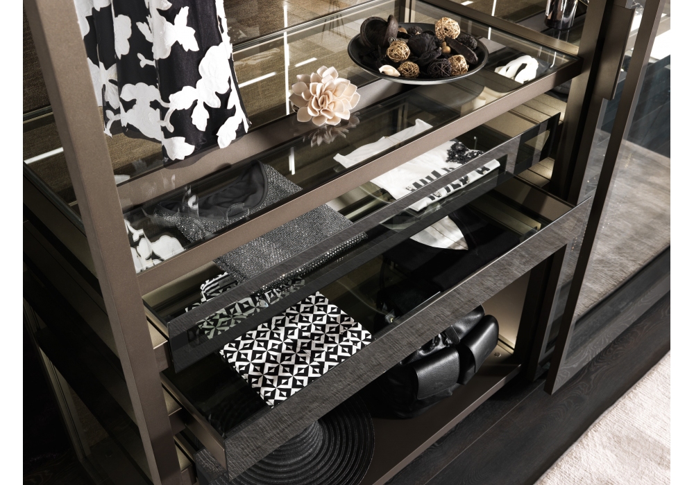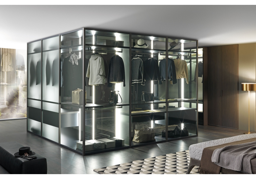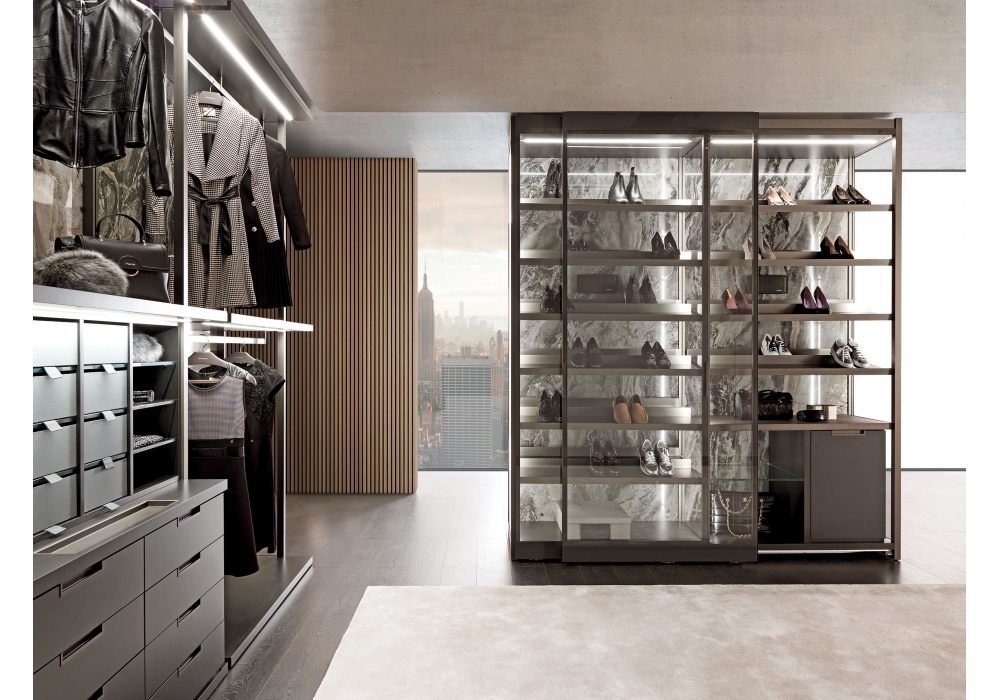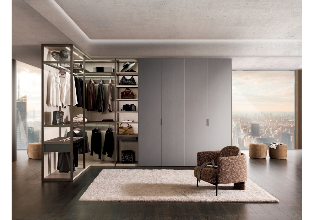 Palo Alto I-Box von Gianni Borgonovo für MisuraEmme entworfen, ist ein Ankleideraum mit exklusivem Scharnier für die Türinstallation. Es bietet unendliche Kompositionsmöglichkeiten zwischen Kleiderschrank und begehbarem Kleiderschrank und erweckt neue Kombinationen zum Leben. Mit einer Vielfalt an feinen Oberflächen und raffinierter LED-Beleuchtung schafft es eine edle Atmosphäre im Schlafbereich.