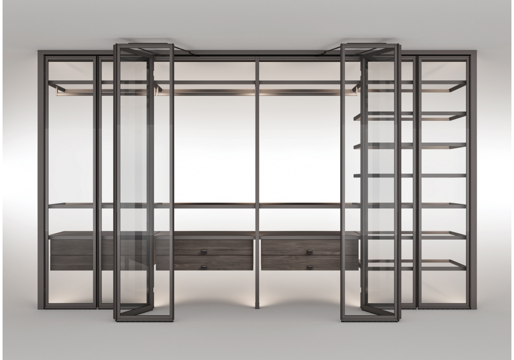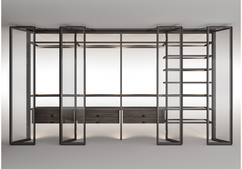 Palo Alto Free von Gianni Borgonovo für MisuraEmme entworfen, ist ein Ankleideraum, bei dem Türen verwendet werden, die direkt von raumhohen Pfosten getragen werden, aus denen die Struktur besteht; dieses einfache verschlusssystem für nischen oder als raumteiler nutzbar unterstützt eine vielfältige ausstattung von fächern. Kompatibel mit allen Türen, die bereits im I-Box-System von Palo Alto vorhanden sind, und mit der Weiterentwicklung der Rex-Tür, die sich durch eine innovative Öffnung mit einem Pantograph-Mechanismus auszeichnet, der es ermöglicht, ein oder mehrere Türpaare aus ihrer geschlossenen Position zu bewegen diejenige mit einer Gesamtöffnung von 180°, die sie auf die Türen des angrenzenden Fachs legt.