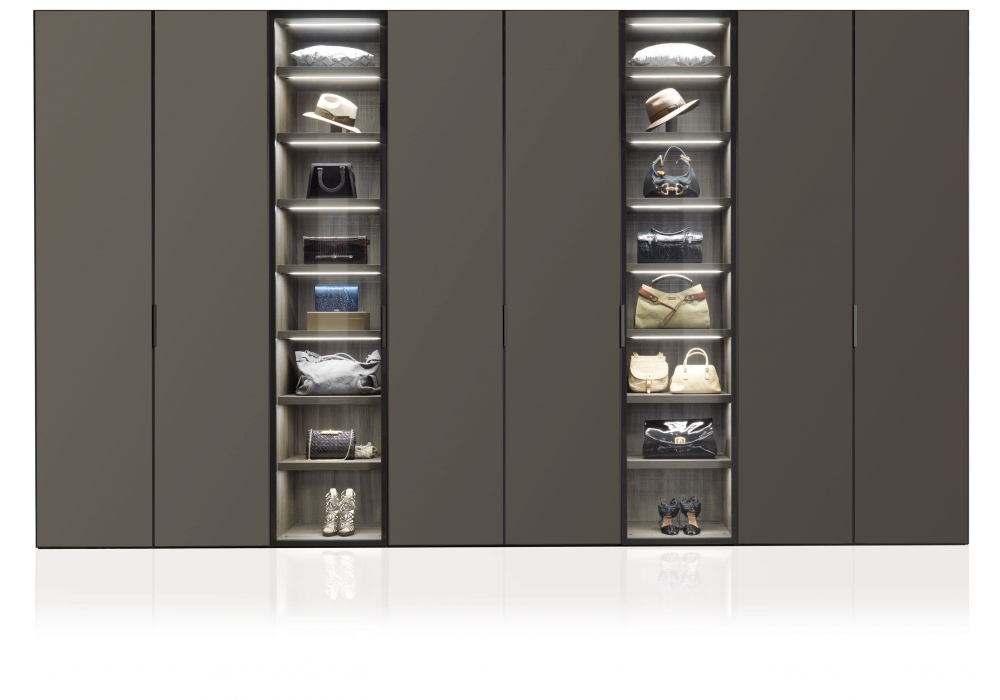 Narcisse von Gianni Borgonovo für MisuraEmme entworfen, ist ein Kleiderschrank mit lackiertem Aluminiumrahmen mit Griff am Profil. Gehärteter Glaseinsatz / gehärteter Spiegel. Glas mit Siebdruckrahmen, mit Biokomponentenkleber an der Tür befestigt.