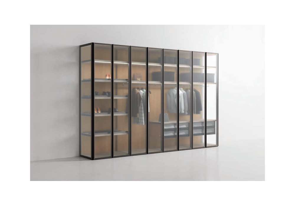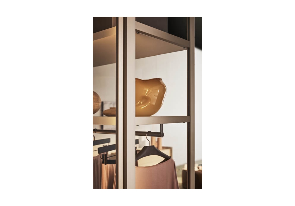 Teatro von Pianca entworfen, ist ein begehbarer Ankleideraum. Die tragende Struktur wird sichtbar und prägt die Geometrie, ein dezenter Rahmen für jeden Inhalt, perfekt für jede Umgebung und jeden Stil. Die durchgehenden Rahmenteiler ohne Innenwände sorgen für visuelle und räumliche Kontinuität und betonen die Leichtigkeit der Architektur und der Volumen. Die Struktur ermöglicht die Positionierung der Kabine sowohl an der Wand als auch in der Raummitte. Die Möglichkeit, Rückenlehnen und Seitenteile einzubeziehen, erweitert die Individualisierungsmöglichkeiten und macht ihn perfekt für die Anpassung an jeden Stil.