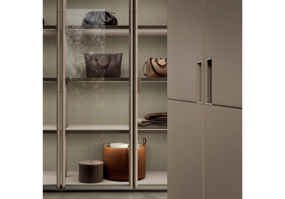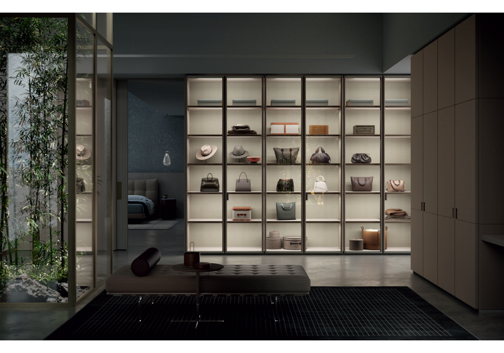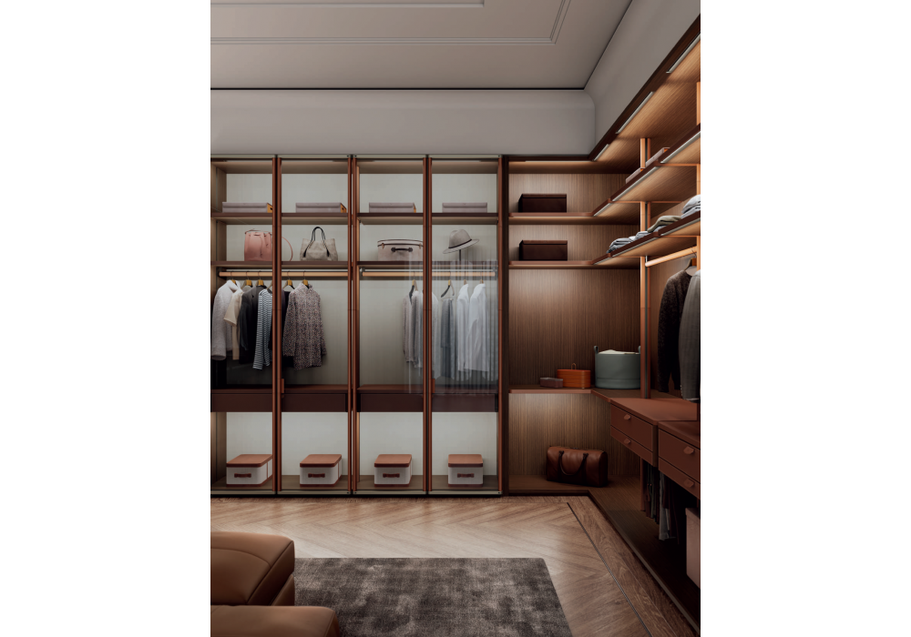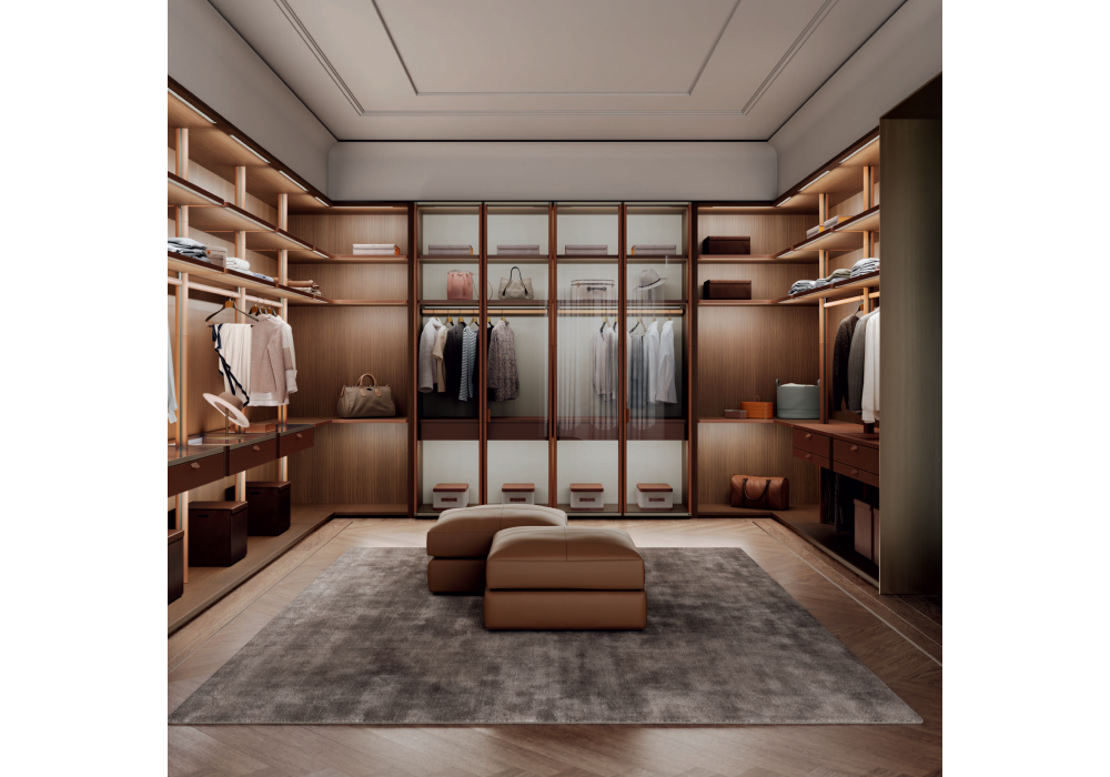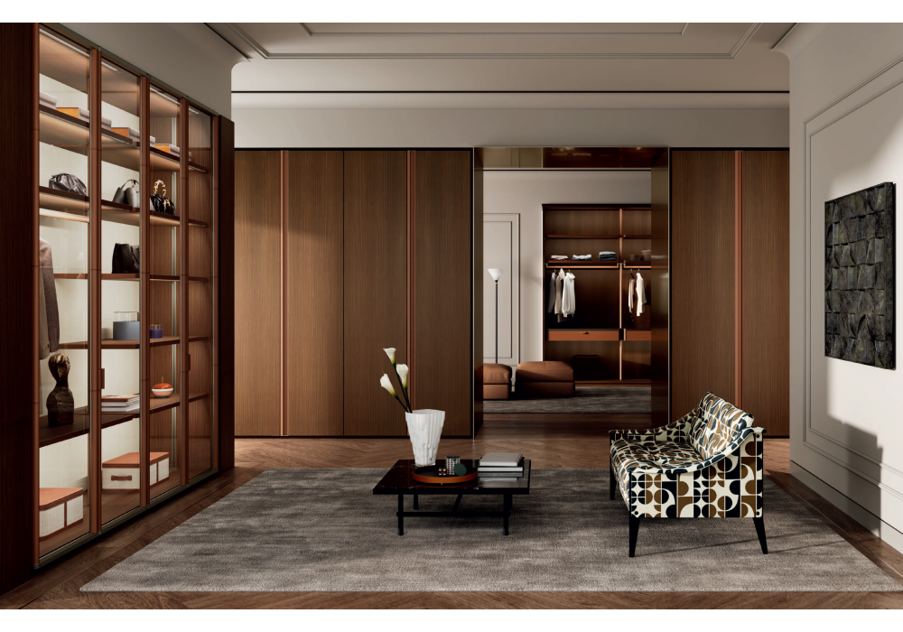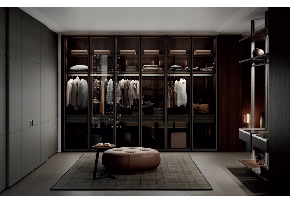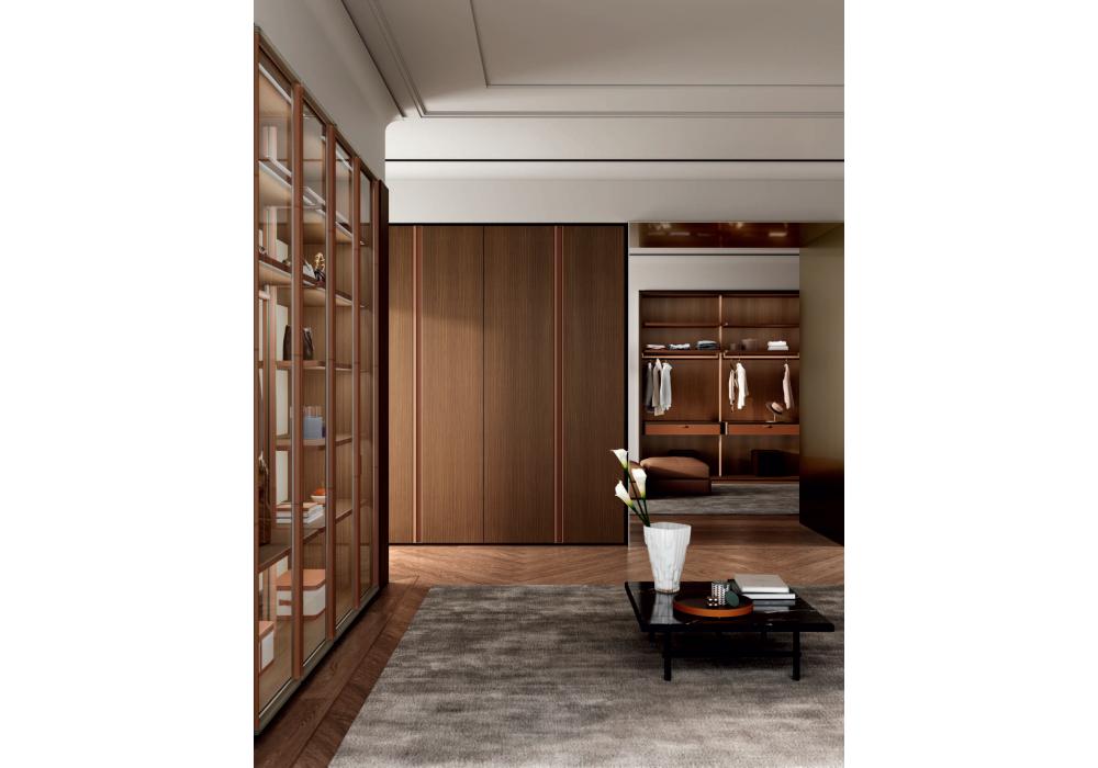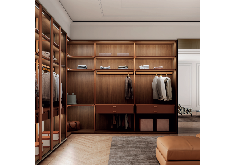 DressCove Night System von Dante Bonuccelli für Poltrona Frau entworfen, ist das erste Komplettsystem für Kleiderschränke und begehbare Kleiderschränke. Es ist eine perfekte Synthese aus Handwerkskunst, Design und individueller Gestaltung und vereint edle Materialien wie Holz, Metall und Pelle Frau® in einer eleganten und funktionalen modularen Struktur. Erhältlich in zwei Konfigurationen – seitliches System und Hochformat – ermöglicht es offene oder geschlossene Lösungen mit Flügel- oder Schiebetüren. Integrierte Beleuchtung, individuelle Accessoires und raffinierte Details runden ein Projekt ab, das den Schlafbereich stilvoll und raffiniert gestaltet.