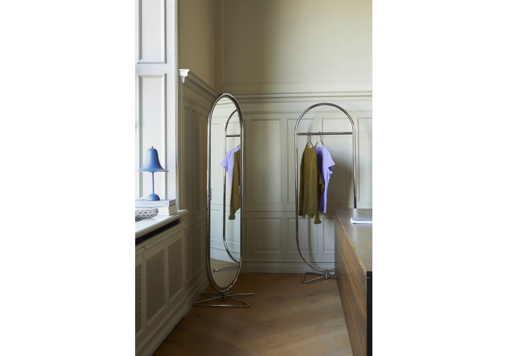 System 1-2-3 von Verner Panton für Verpan entworfen, ist ein Garderobenständer mit verchromter Stahlstruktur und stahlbeschichtetem, um 360° drehbarem Schmetterlingssockel.